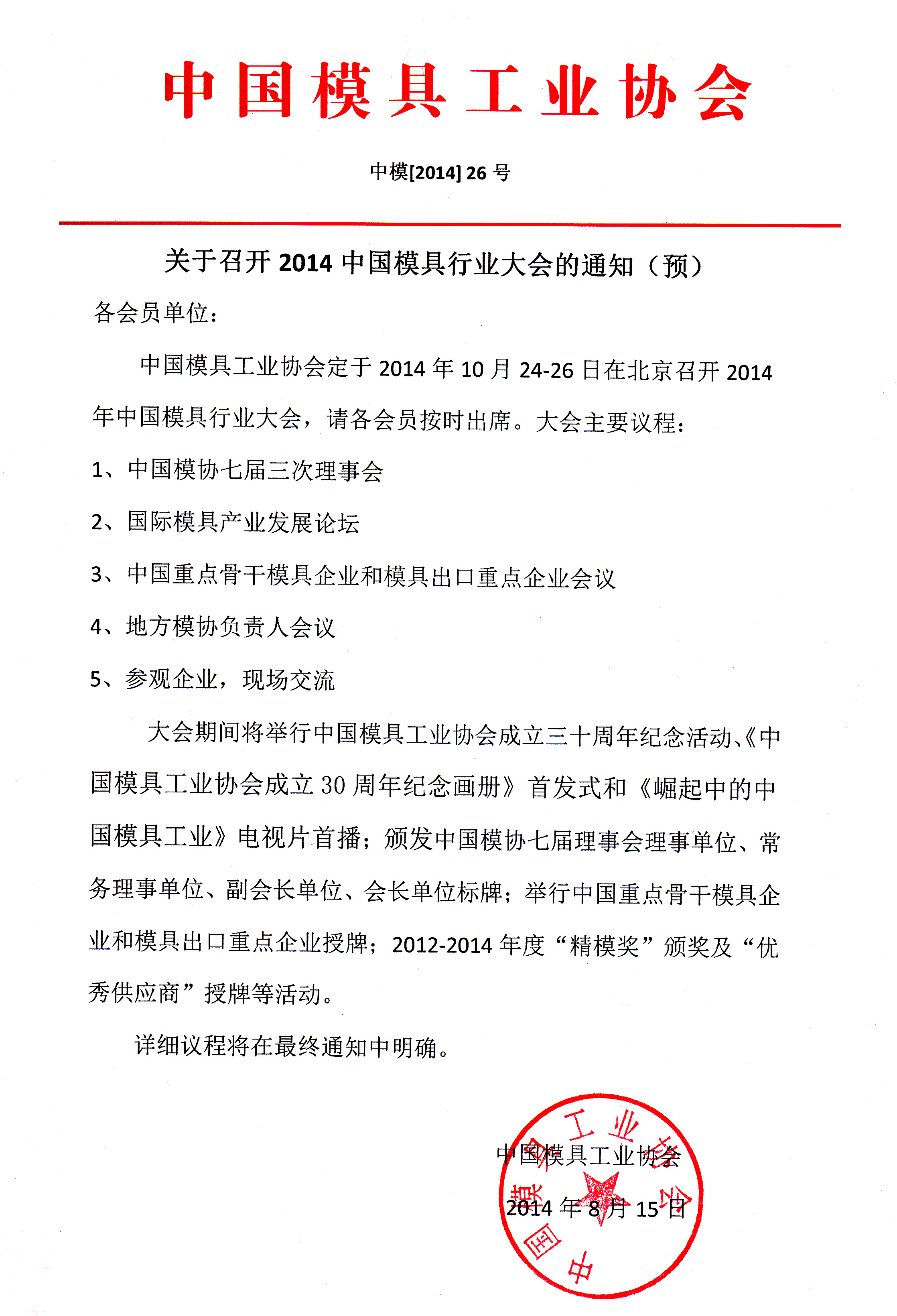 關(guān)于召開2014中國(guó)模具行業(yè)大會(huì)的通知(預(yù))