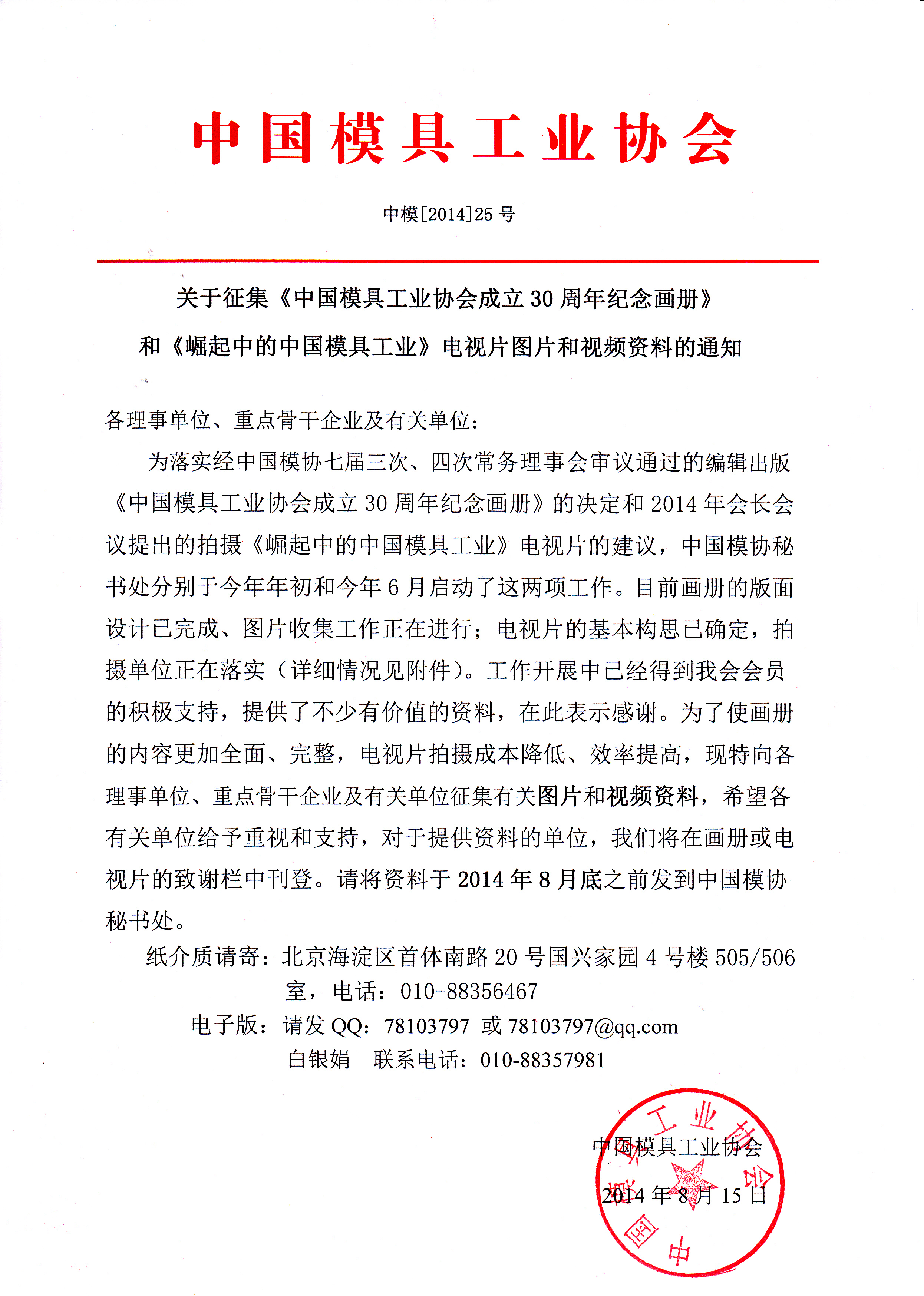 關(guān)于征集《中國模具工業(yè)協(xié)會成立30周年紀念畫冊》和《崛起中的中國模具工業(yè)》電視片圖片和視頻資料的通知