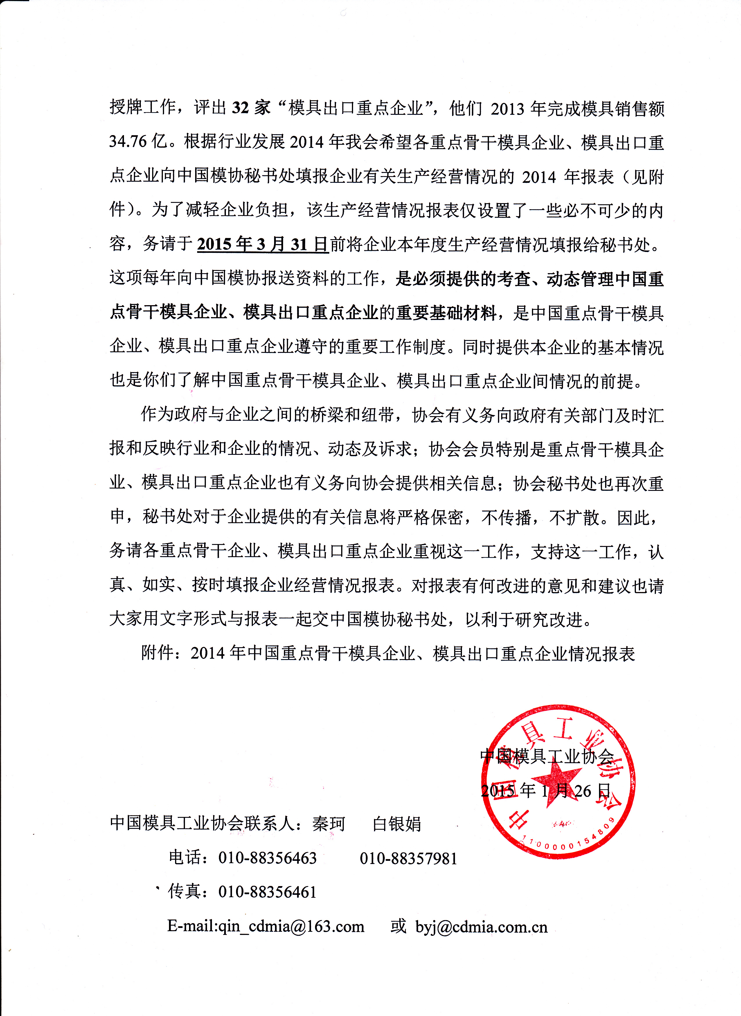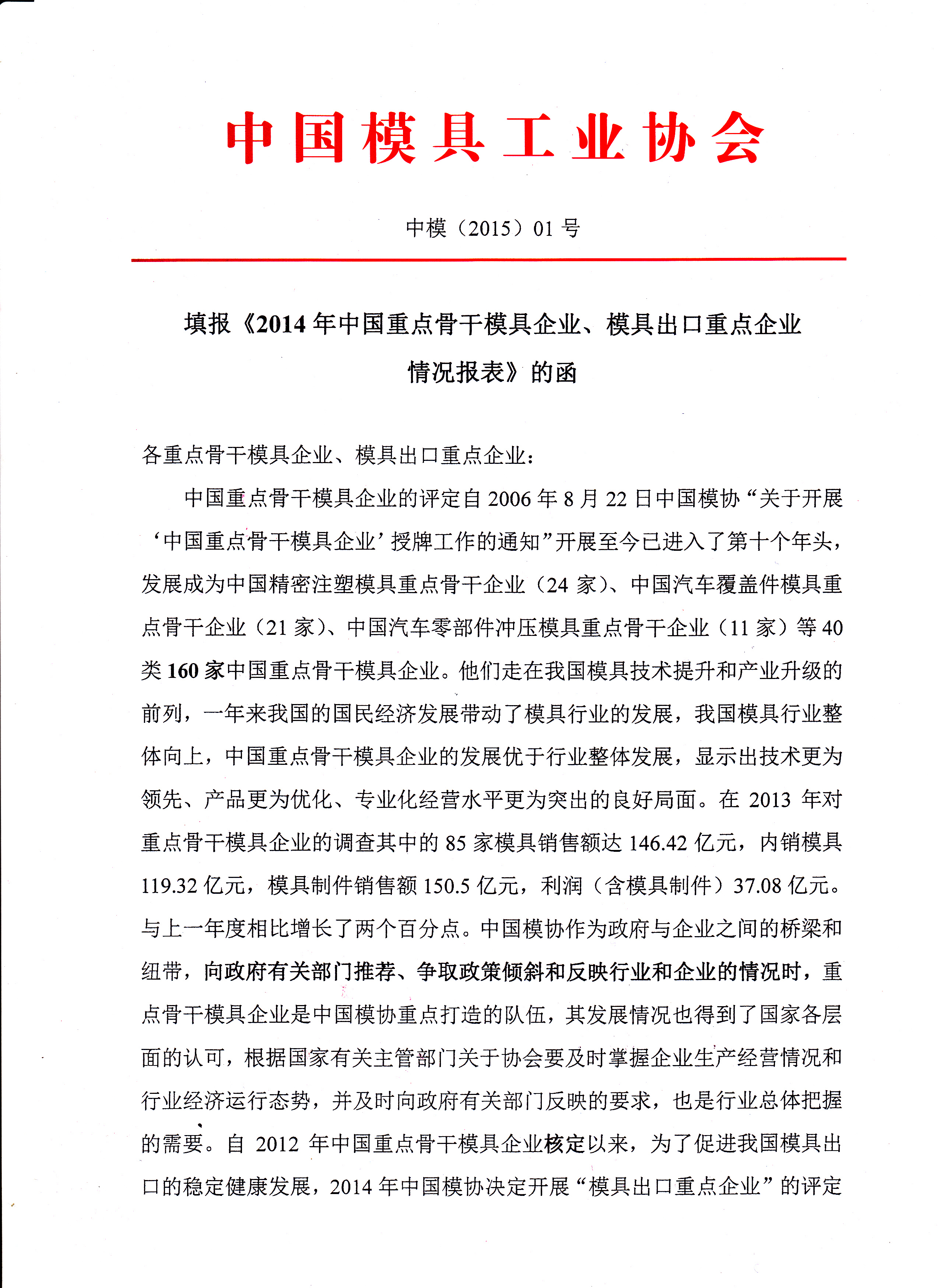 填報《2014年中國重點骨干模具企業、模具出口重點企業情況報表》的函