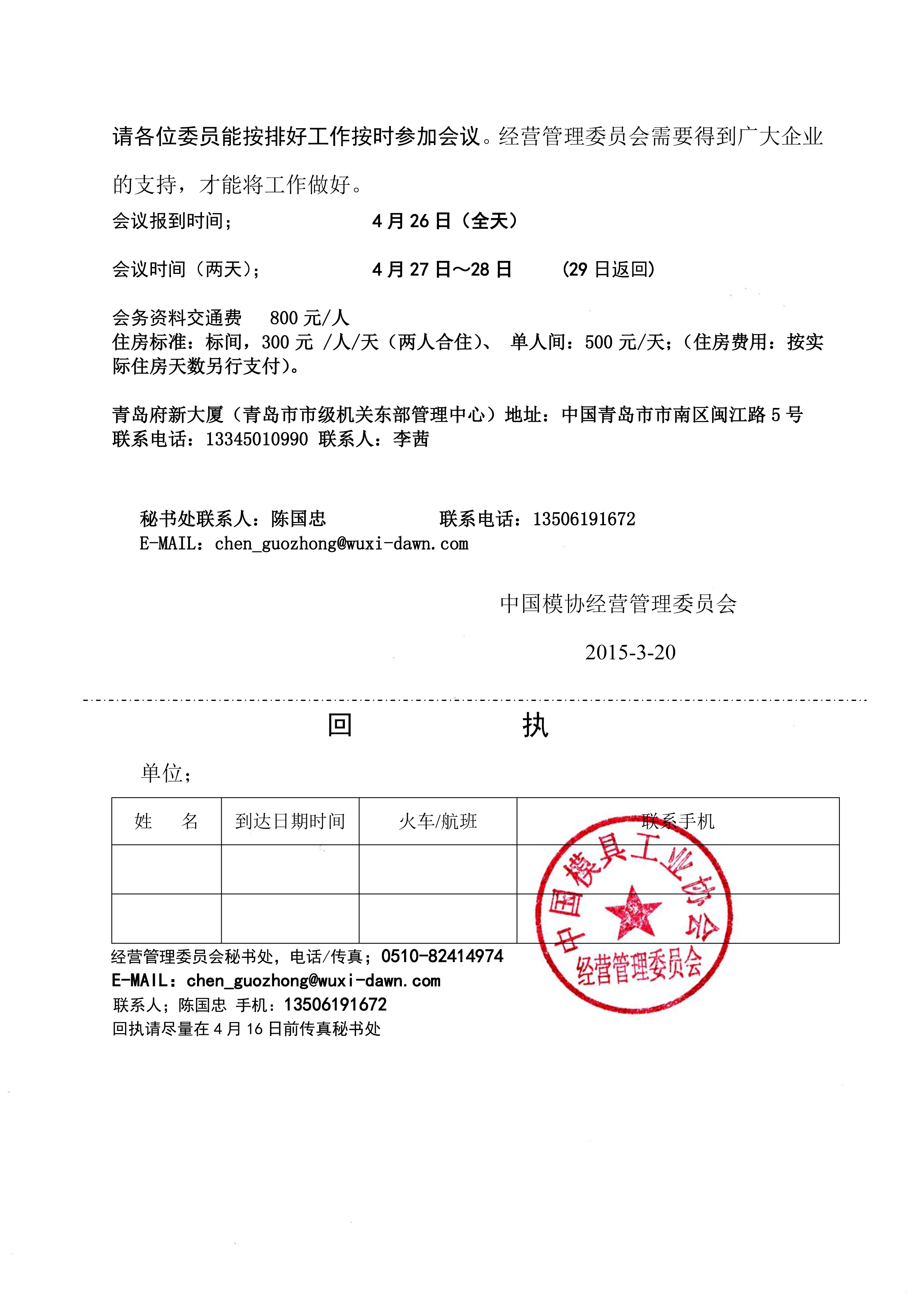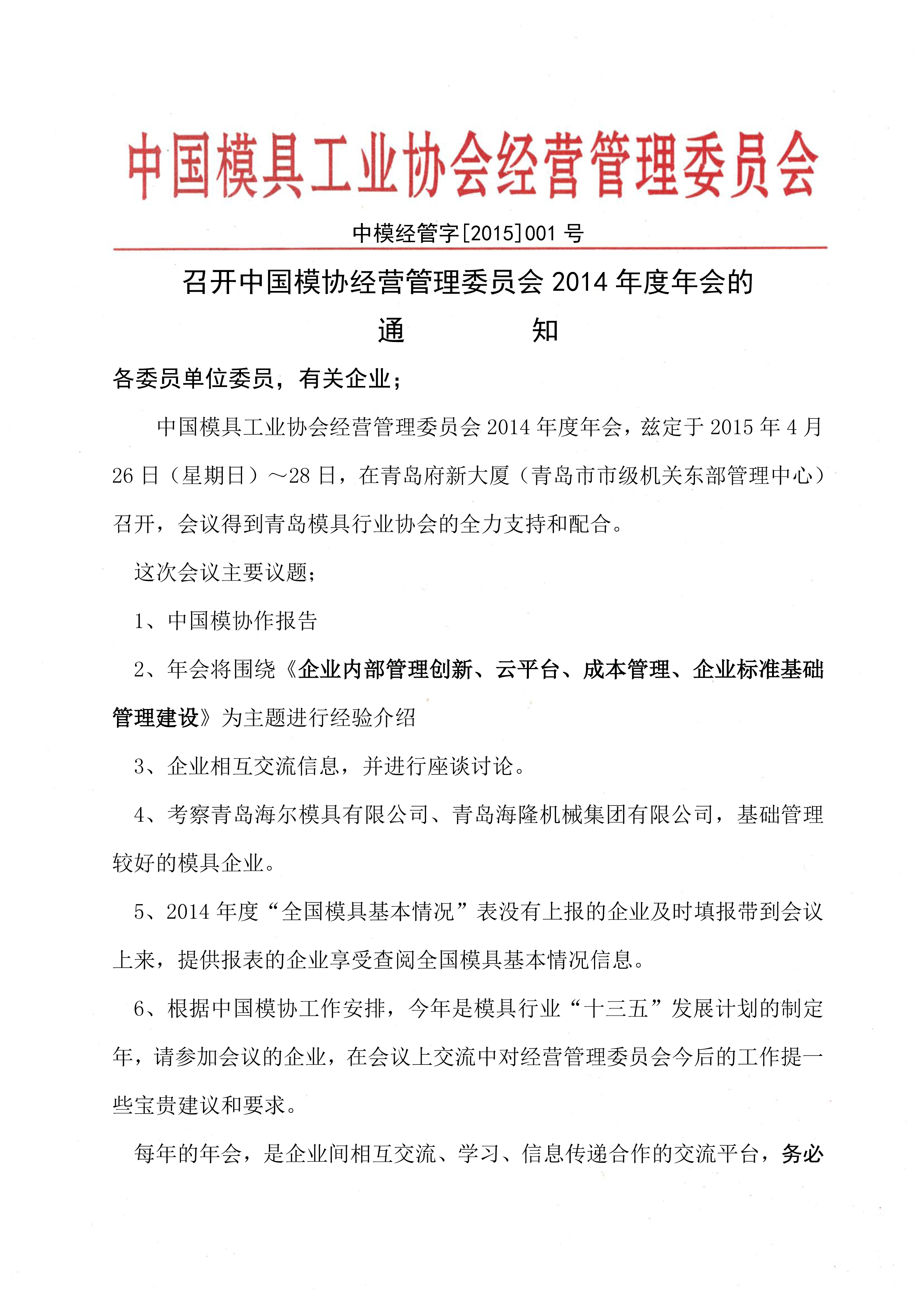 召開中國模協(xié)經(jīng)營管理委員會(huì)2014年度年會(huì)的通知