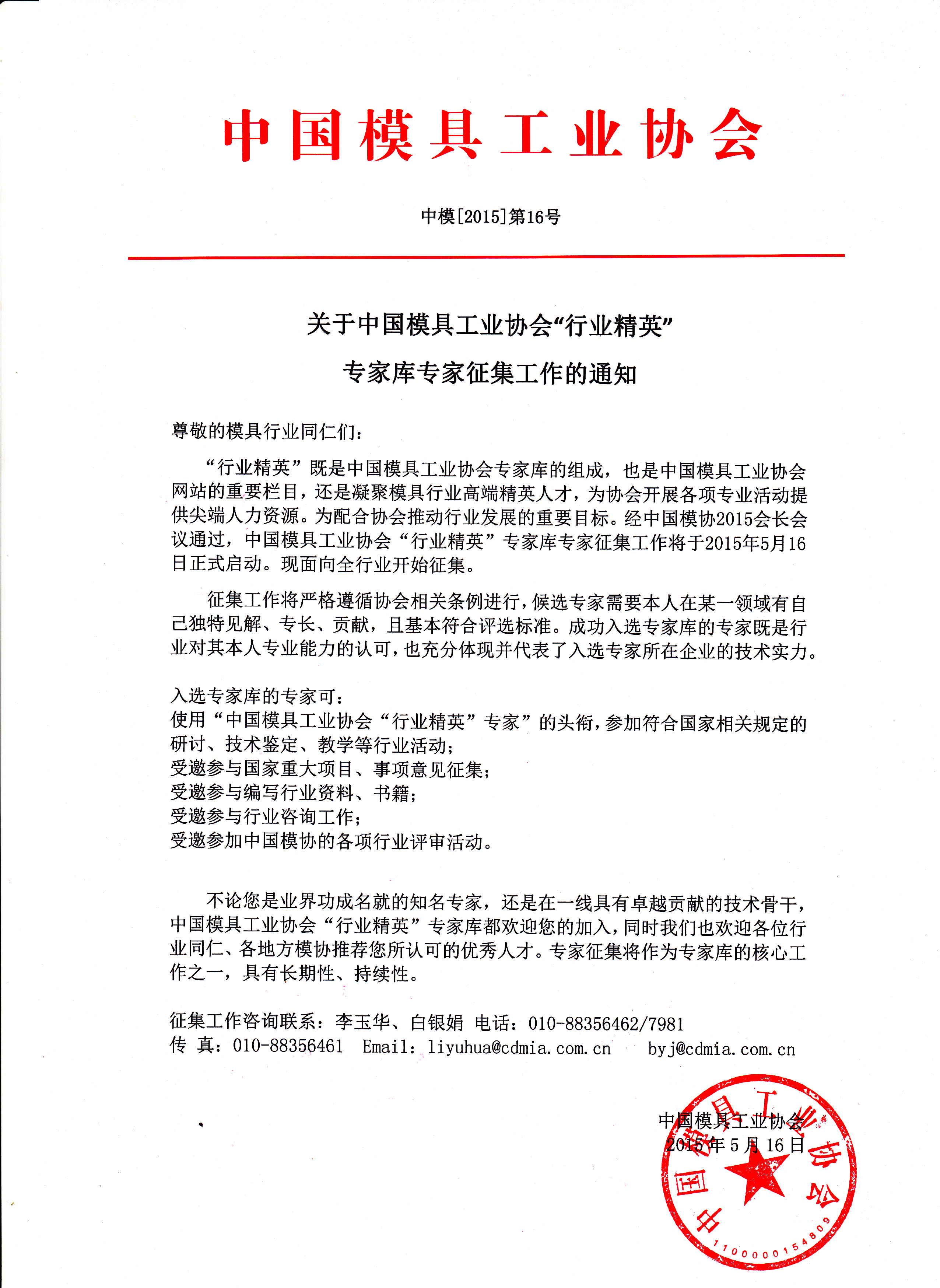 關于中國模具工業協會“行業精英”專家庫專家征集工作的通知