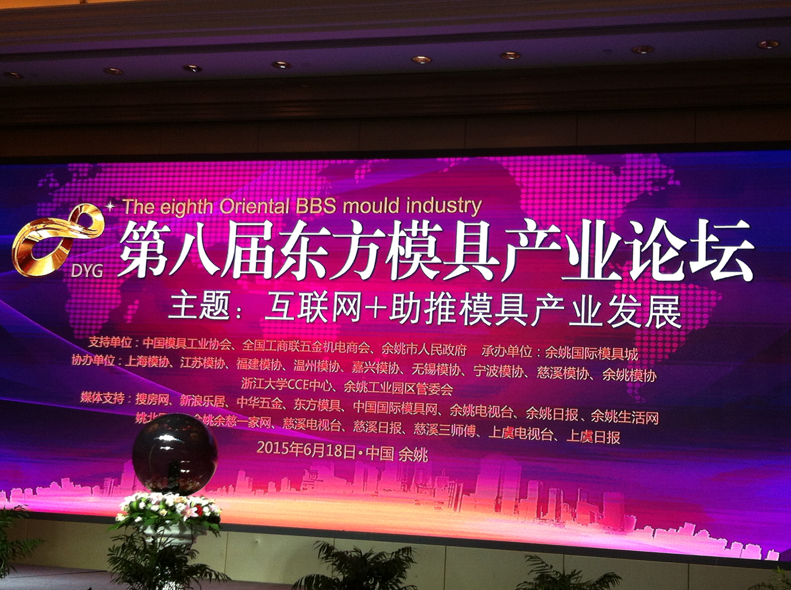 | 2015年6月18日上午,由余姚國際模具城主辦、余姚世模投資有限公司承辦的第八屆東方模具產業論壇暨余姚國際模具城首批進駐企業簽約儀式在余姚市太平洋大酒店隆重召開。 中國模具工業協會作為支持單位,常務副會長兼秘書長武兵書、常務副秘書長秦珂受邀參加了此次論壇。近千人見證了此次盛會。余姚電視臺主持人海明主持本次論壇。      本次論壇主題是“互聯網+ 助推模具產業發展”,旨在為中國模具工業互聯網+發展構建思路、探討科技創新為中國模具企業發展帶來的機遇與挑戰。      論壇首先由多元集團董事長張堅致歡迎詞,隨后重要嘉賓發表講話;然后由多元集團董事長為項目特聘顧問頒發聘書并合影、余姚國際模具城項目負責人與首批進駐企業代表上臺簽訂協議,余姚市長、勞健斌、武兵書、張堅等領導共同按動“模客會”啟動球。全國工商聯五金機電商會會長勞健斌在致辭中肯定了模具產業在五金機電行業中發揮了重要作用;論壇最后在嘉賓演講中步入尾聲。