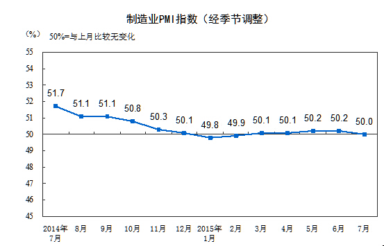 | 統(tǒng)計局:7月中國制造業(yè)PMI為50.0% 位于臨界點   國家統(tǒng)計局服務業(yè)調查中心 中國物流與采購聯(lián)合會   2015年7月份,中國制造業(yè)采購經理指數(shù)(PMI)為50.0%,比上月回落0.2個百分點,位于臨界點。   分企業(yè)規(guī)模看,大、中、小型企業(yè)PMI均有所回落。其中,大型企業(yè)PMI為50.6%,雖比上月回落0.2個百分點,但仍連續(xù)位于擴張區(qū)間;中型企業(yè)PMI為50.0%,比上月回落0.2個百分點,位于臨界點;小型企業(yè)PMI為46.9%,比上月下降0.6個百分點,繼續(xù)位于收縮區(qū)間。   從分類指數(shù)看,在構成制造業(yè)PMI的5個分類指數(shù)中,生產指數(shù)和供應商配送時間指數(shù)繼續(xù)高于臨界點,新訂單指數(shù)、從業(yè)人員指數(shù)和原材料庫存指數(shù)均低于臨界點。   生產指數(shù)為52.4%,比上月回落0.5個百分點,高于臨界點,表明制造業(yè)生產保持增長,但增速放緩。   新訂單指數(shù)為49.9%,比上月下降0.2個百分點,降至臨界點以下,表明制造業(yè)市場需求略有減弱。   從業(yè)人員指數(shù)為48.0%,比上月微降0.1個百分點,繼續(xù)低于臨界點,表明制造業(yè)企業(yè)用工量回落。   原材料庫存指數(shù)為48.4%,比上月下降0.3個百分點,位于臨界點下方,表明制造業(yè)生產用原材料庫存量持續(xù)減少。   供應商配送時間指數(shù)為50.4%,比上月微升0.1個百分點,高于臨界點,表明制造業(yè)原材料供應商交貨時間繼續(xù)加快。