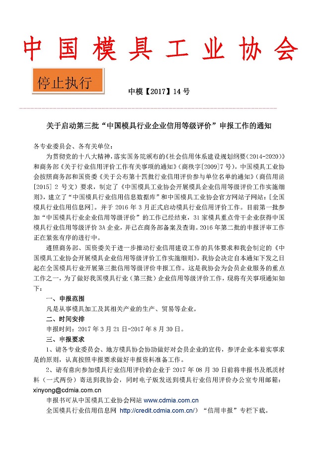 關(guān)于啟動(dòng)第三批“中國(guó)模具行業(yè)企業(yè)信用等級(jí)評(píng)價(jià)”申報(bào)工作的通知