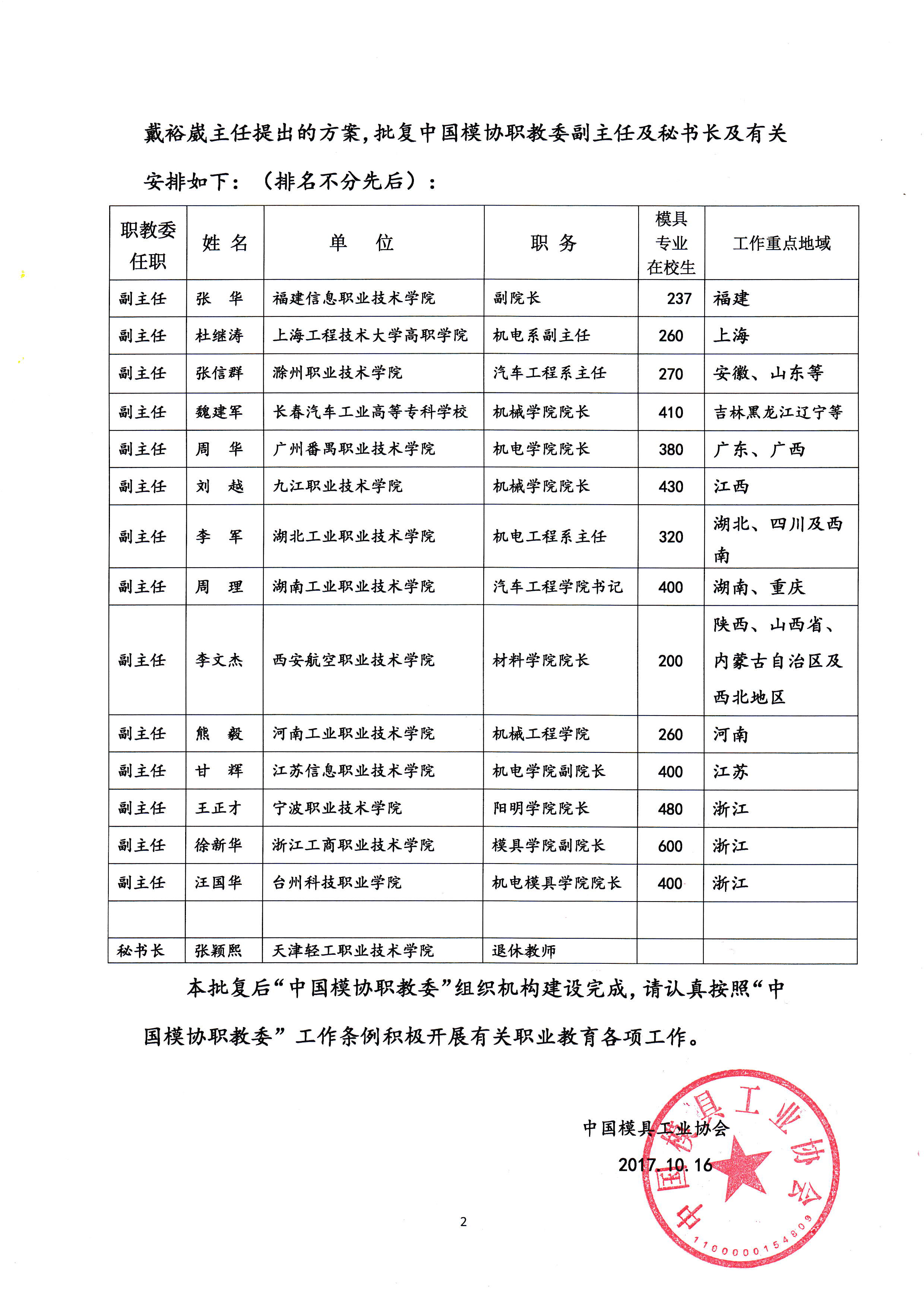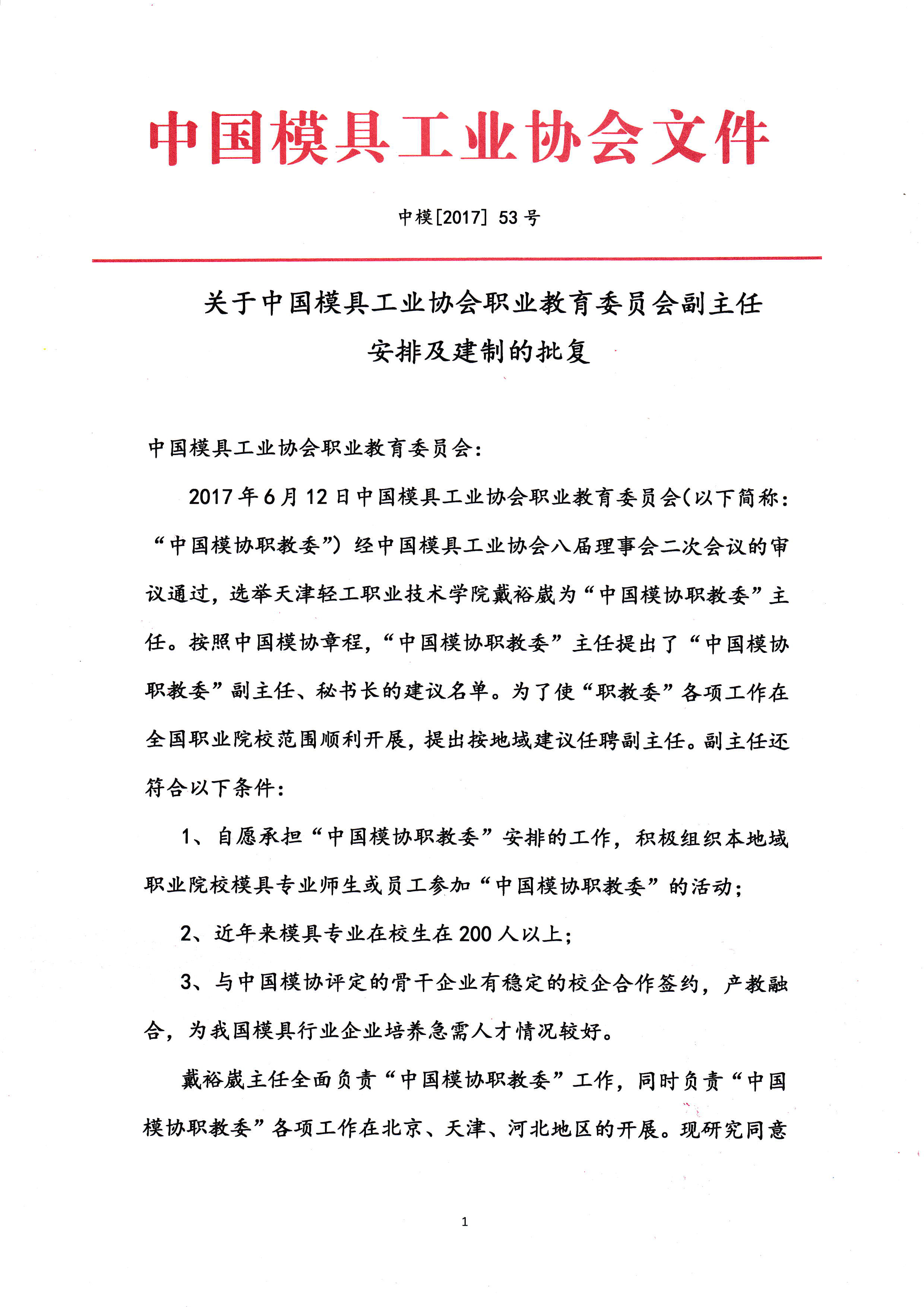 關于中國模具工業協會職業教育委員會副主任安排及建制的批復