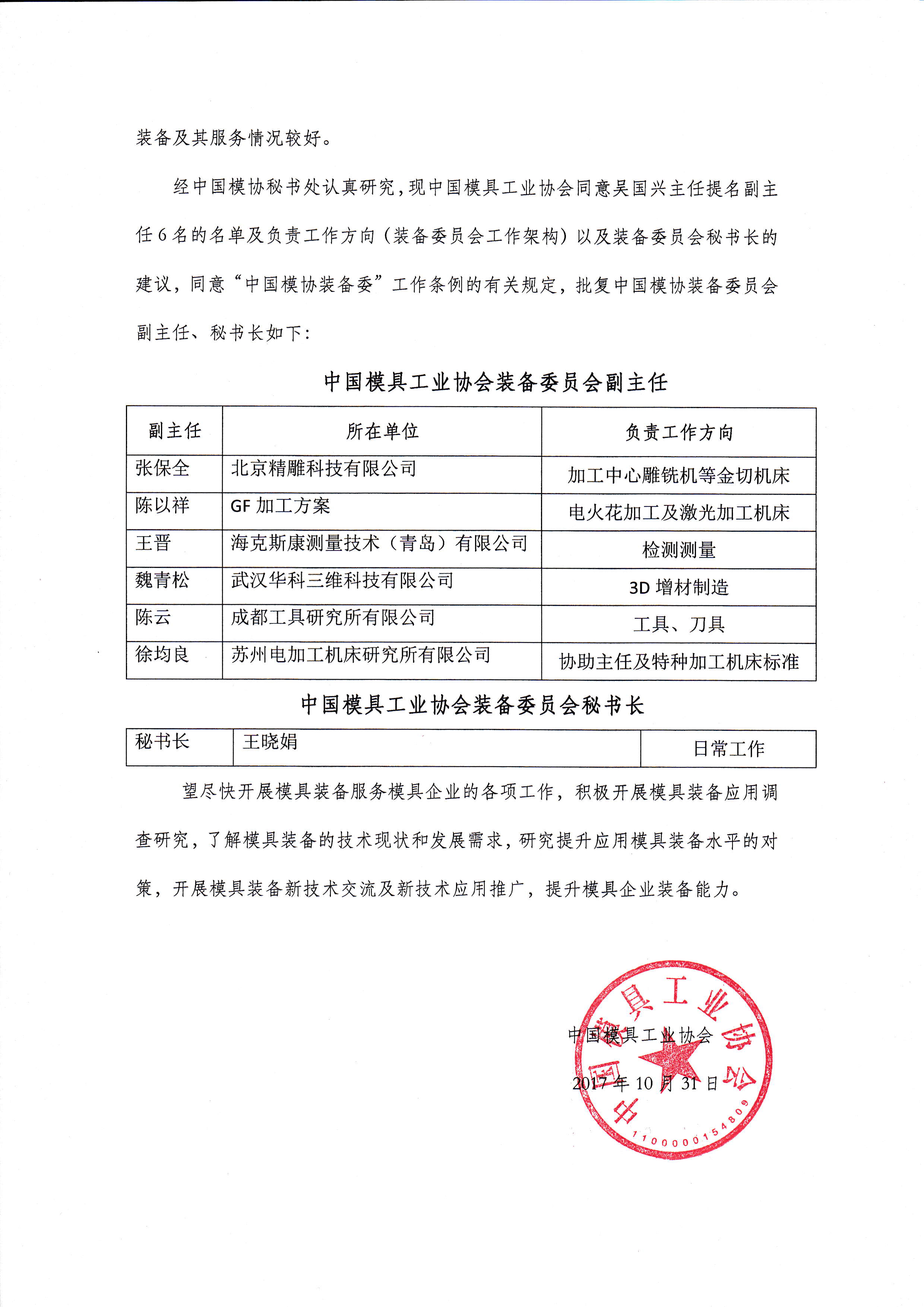 中國模具工業協會裝備委員會副主任、秘書長組成及工作架構的批復