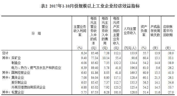 1-10月份,規(guī)模以上工業(yè)企業(yè)每百元主營業(yè)務收入中的成本為85.46元,同比減少0.26元;每百元主營業(yè)務收入中的費用為7.38元,同比減少0.25元;每百元資產實現的主營業(yè)務收入為112.1元,同比增加4.6元;人均主營業(yè)務收入為133.9萬元,同比增加15.9萬元;產成品存貨周轉天數為13.9天,同比減少0.6天;應收賬款平均回收期為38天,同比減少1天。