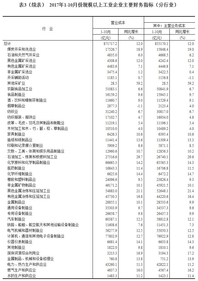 1-10月份,規(guī)模以上工業(yè)企業(yè)實現主營業(yè)務收入100.1萬億元,同比增長12.4%;發(fā)生主營業(yè)務成本85.5萬億元,增長12%;主營業(yè)務收入利潤率為6.24%,同比提高0.55個百分點。