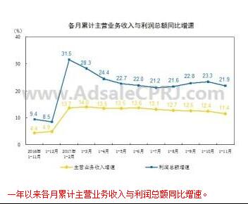據(jù)國家統(tǒng)計局最新統(tǒng)計顯示,2017年1~11月中國規(guī)模以上工業(yè)企業(yè)實(shí)現(xiàn)主營業(yè)務(wù)收入108萬億元人民幣(下同),同比增長11.4%;實(shí)現(xiàn)利潤總額68750.1億元,同比增長21.9%,增速比1-10月份放緩1.4個百分點(diǎn)。發(fā)生主營業(yè)務(wù)成本92.1萬億元,同比增長11.1%。