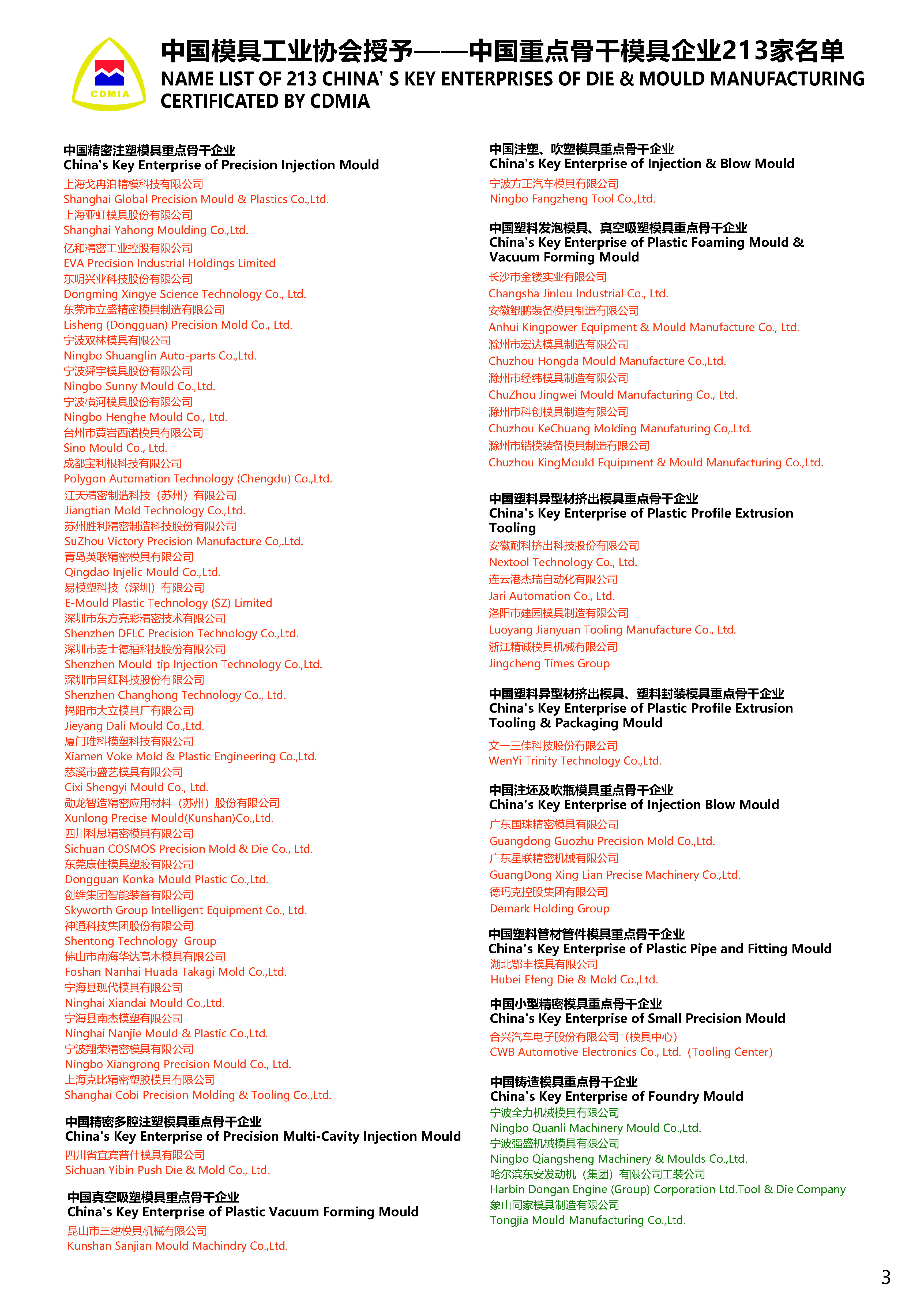 China‘s Key Enterprises of Die & Mould Manufacturing Certificated by CDMIA