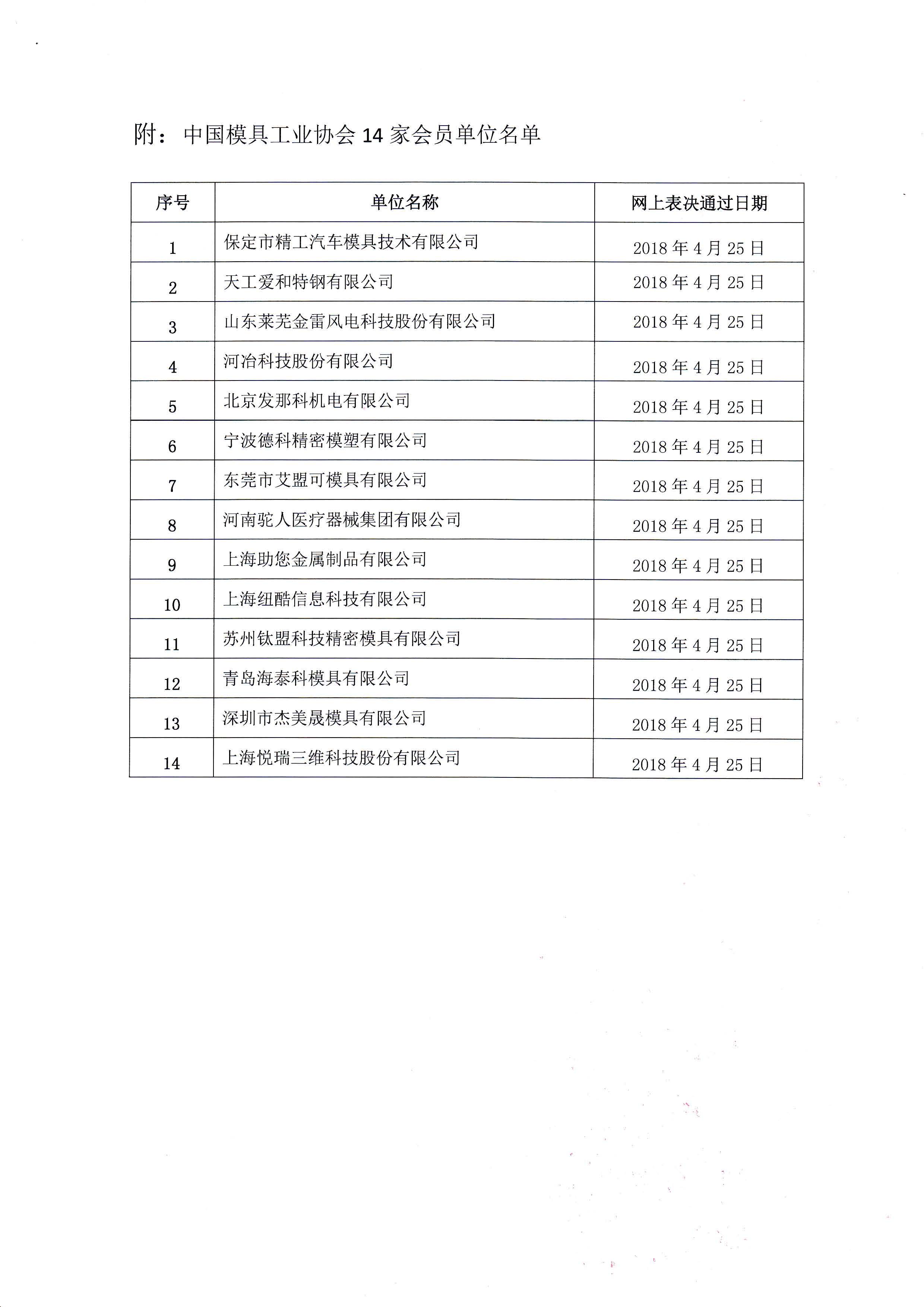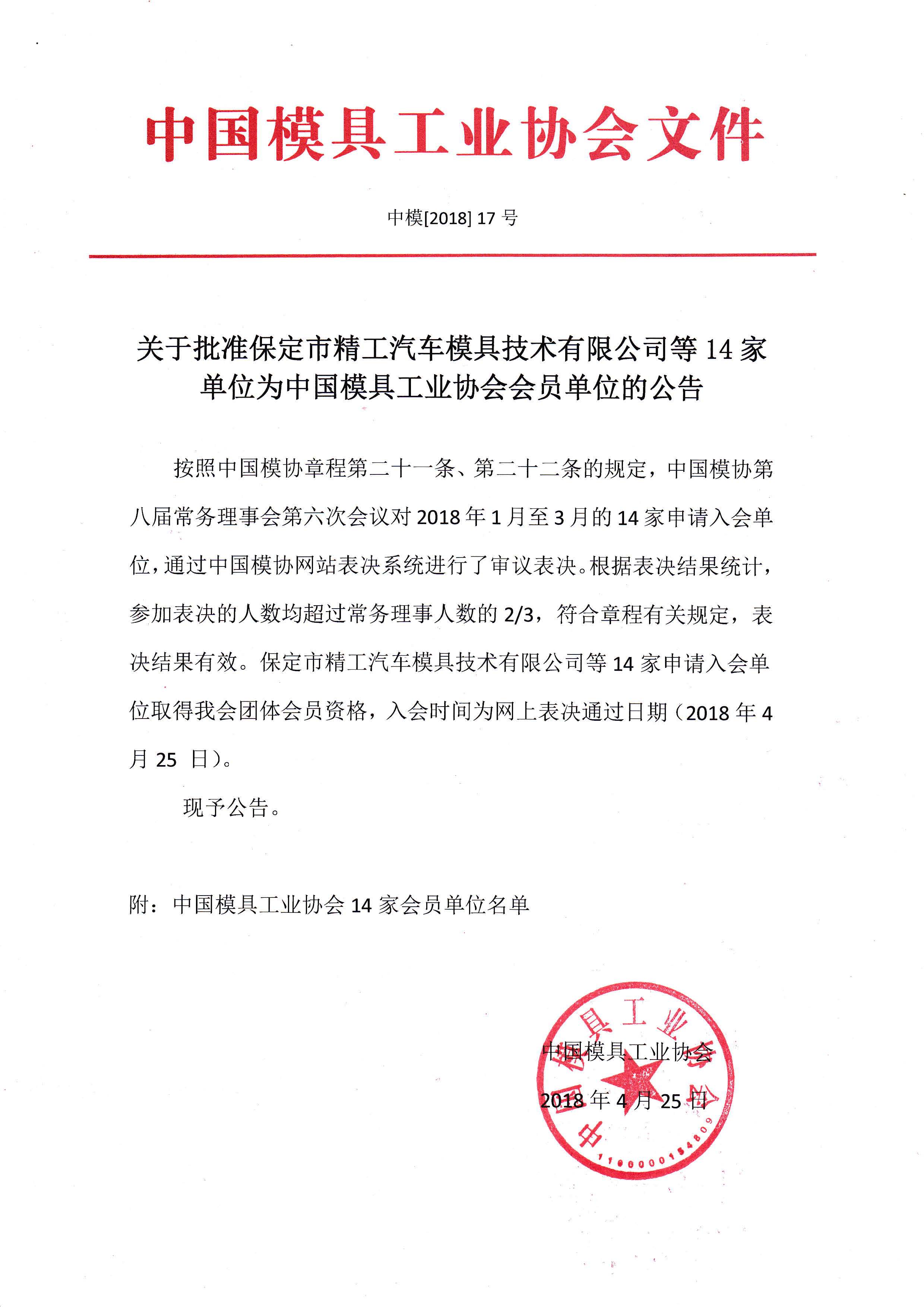 關于批準保定市精工汽車模具技術有限公司等14家單位為中國模具工業協會會員單位的公告