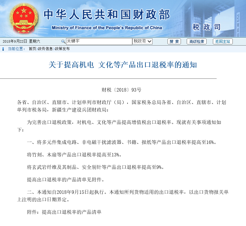 中華人民共和國財政部官網發布的《關于提高機電 文化等產品出口退稅率的通知》財稅(2018)93號 中所列產品從