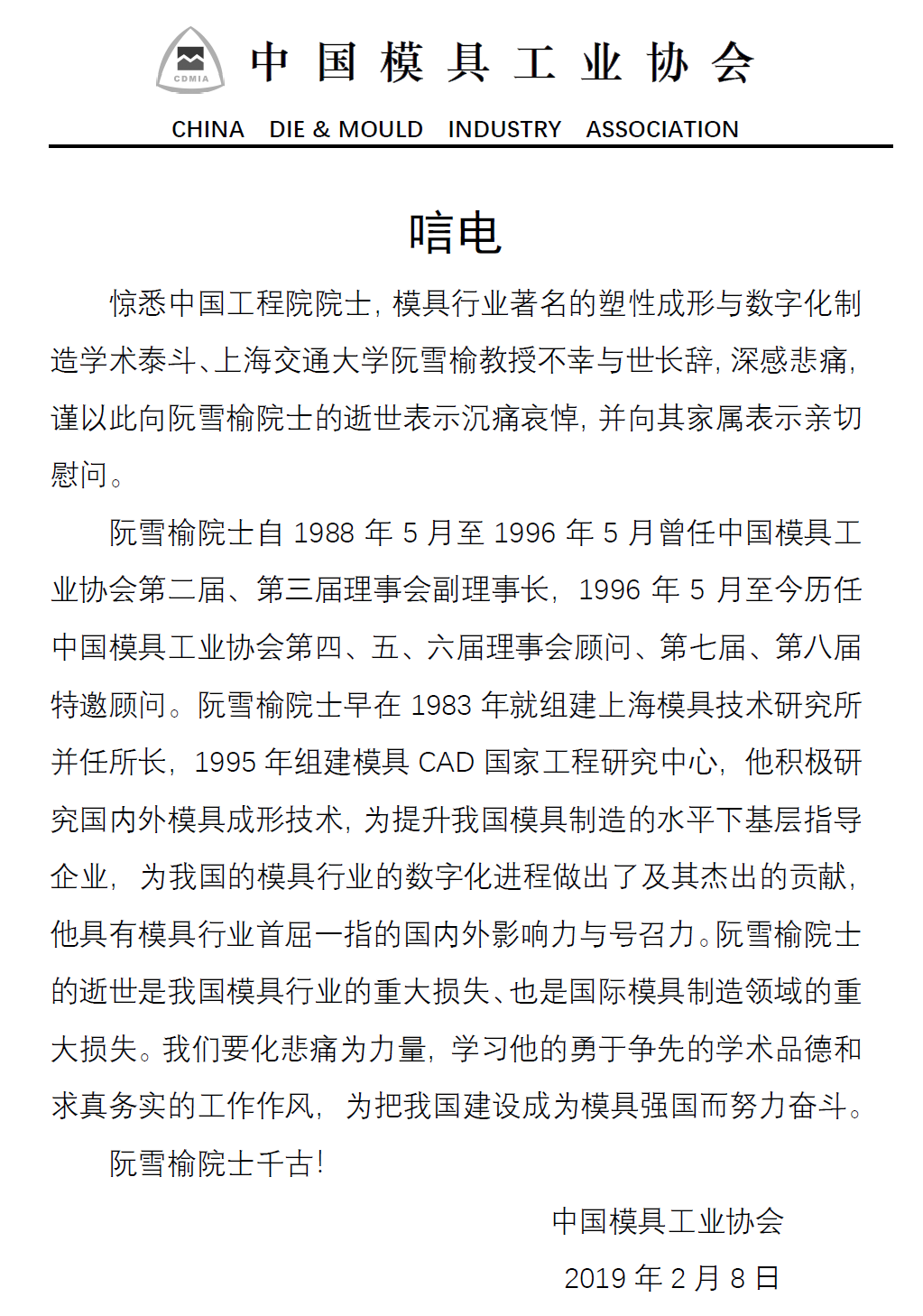 2月11日在滬阮院士告別儀式,李建軍副會長和趙震副會長都代表中國模協致意阮院士家屬,寄托我們中國模具行業的哀思。中國模協送了花圈也發了唁電。