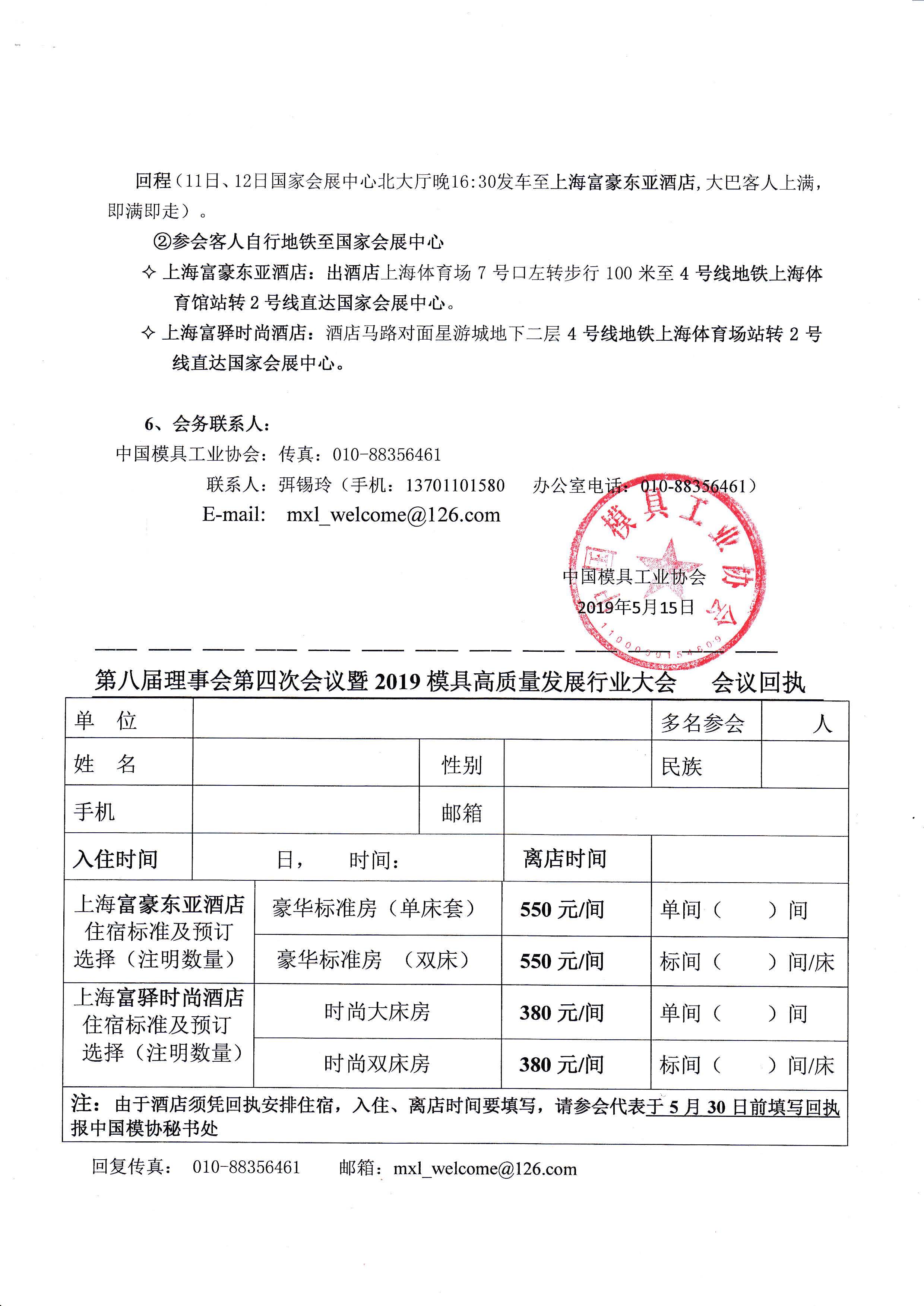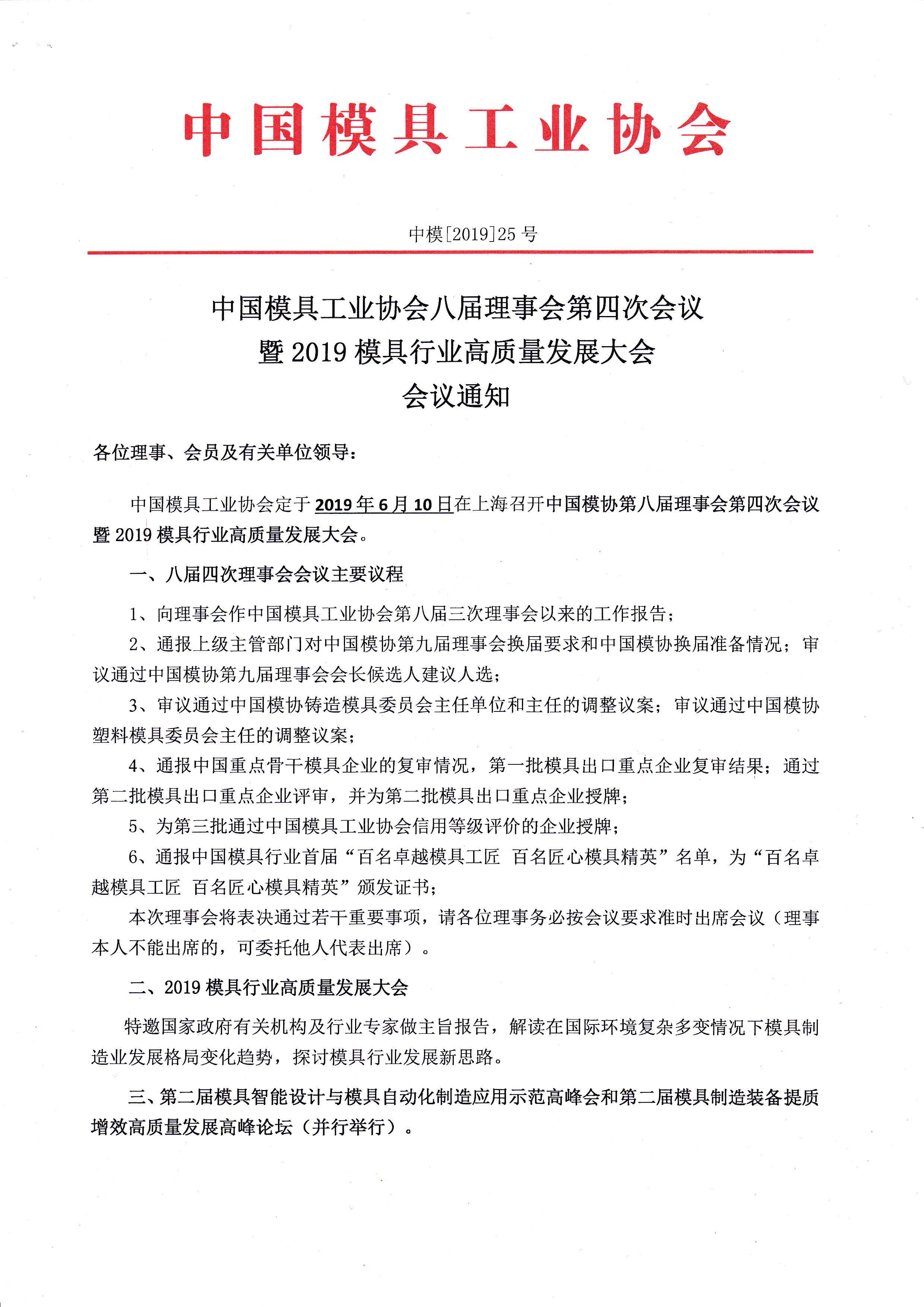 中國(guó)模具工業(yè)協(xié)會(huì)八屆理事會(huì)第四次會(huì)議暨2019模具行業(yè)高質(zhì)量發(fā)展大會(huì)會(huì)議通知