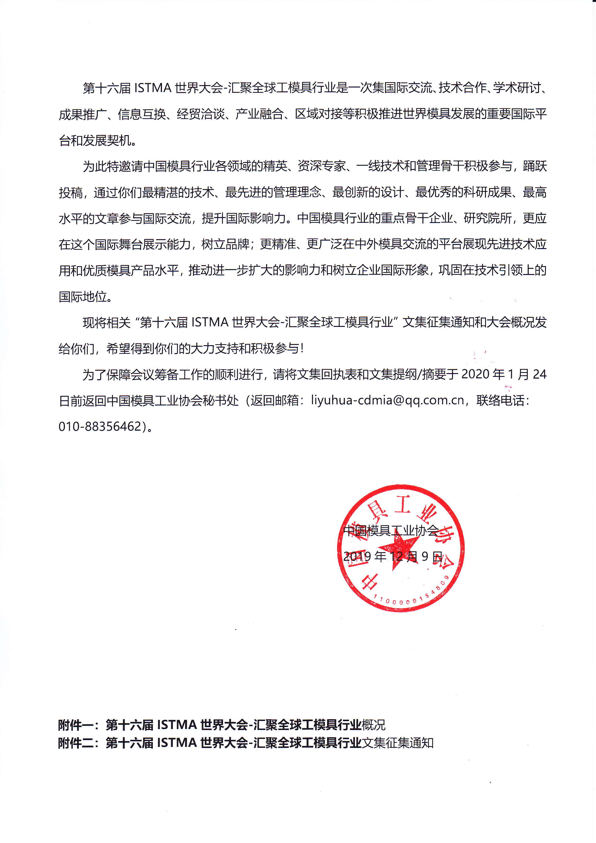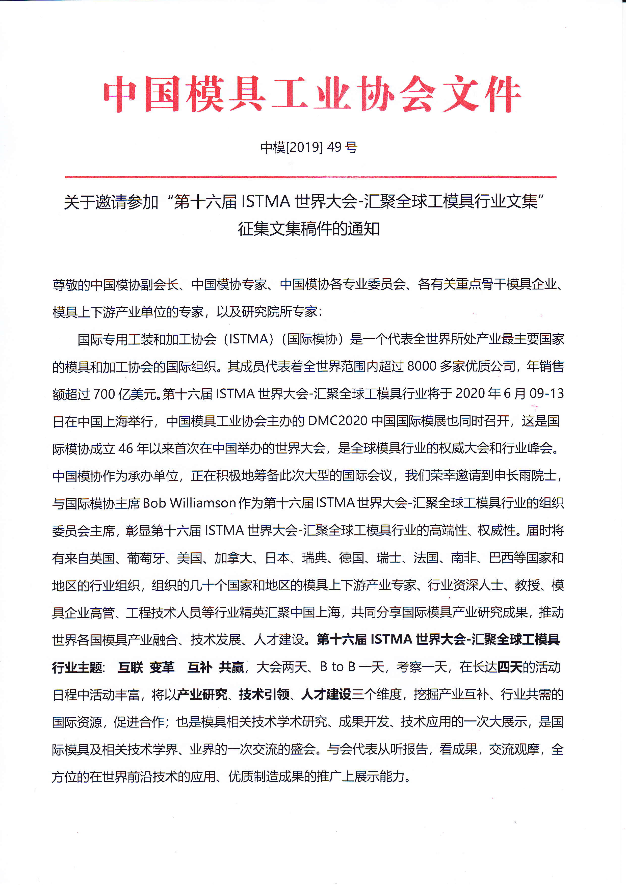 關于邀請參加“第十六屆ISTMA世界大會——匯聚全球工模具行業文集”征集文集稿件的通知