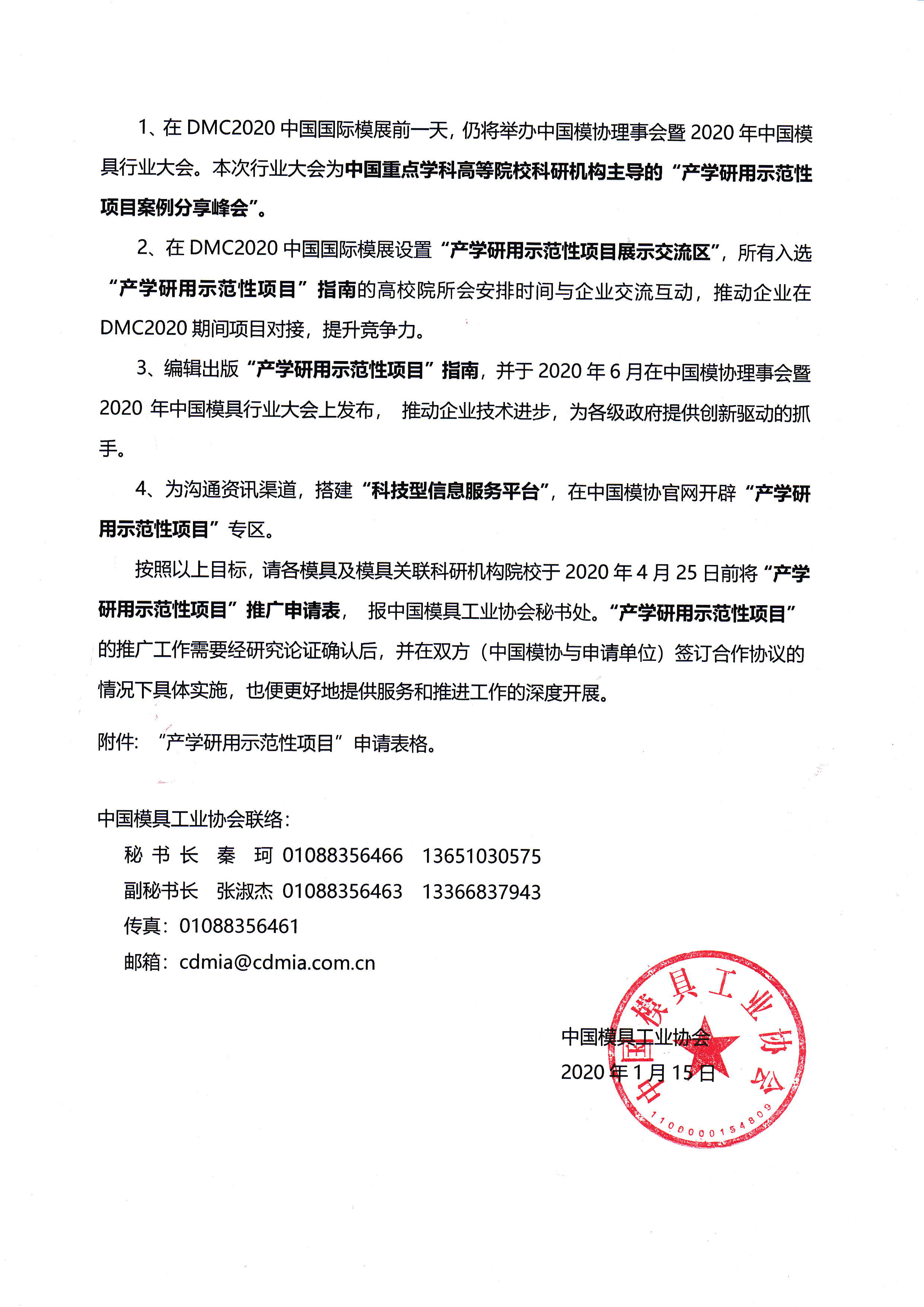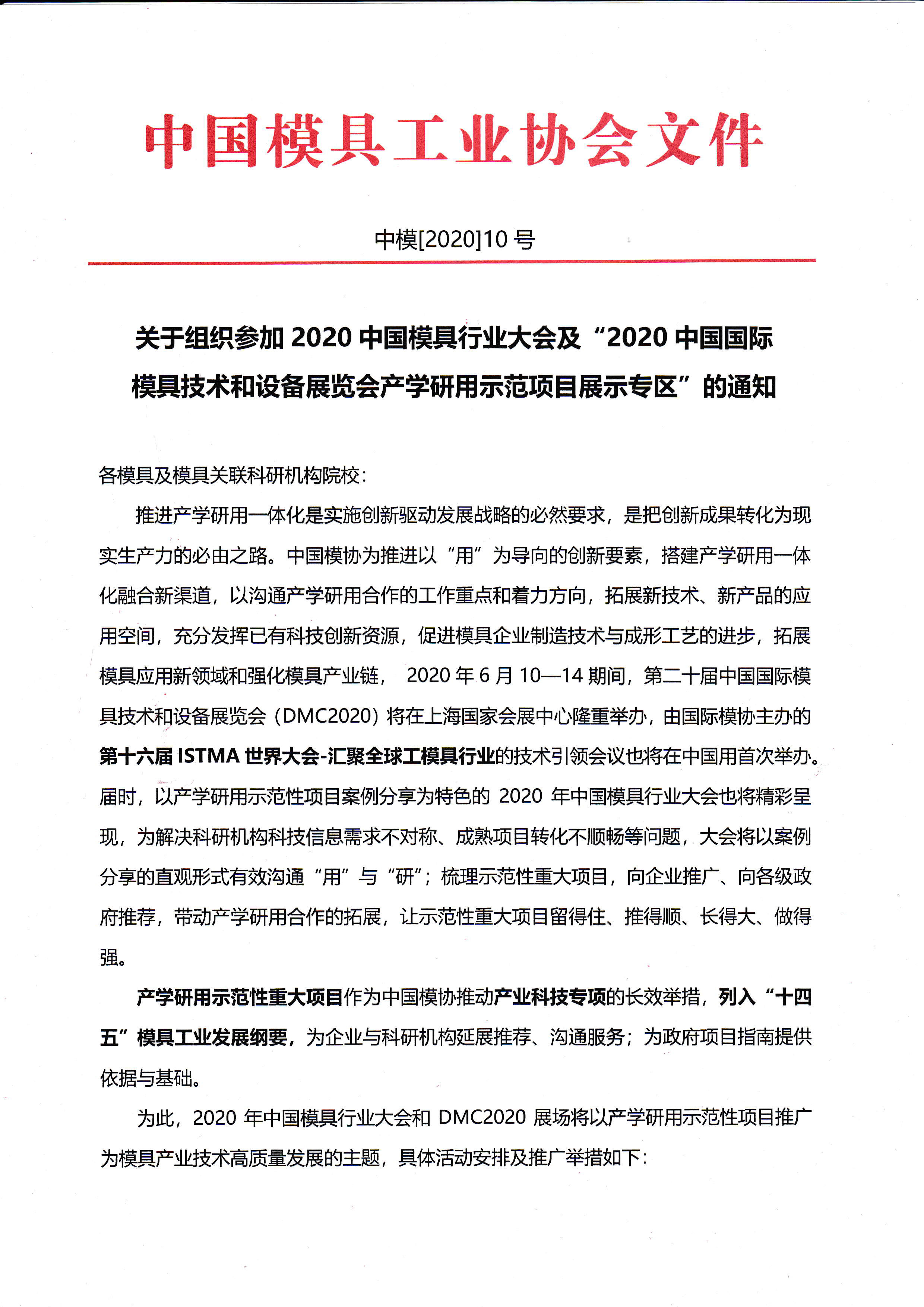 關于組織參加2020中國模具行業大會及“2020中國國際模具技術和設備展覽會產學研用示范項目展示專區”的通知