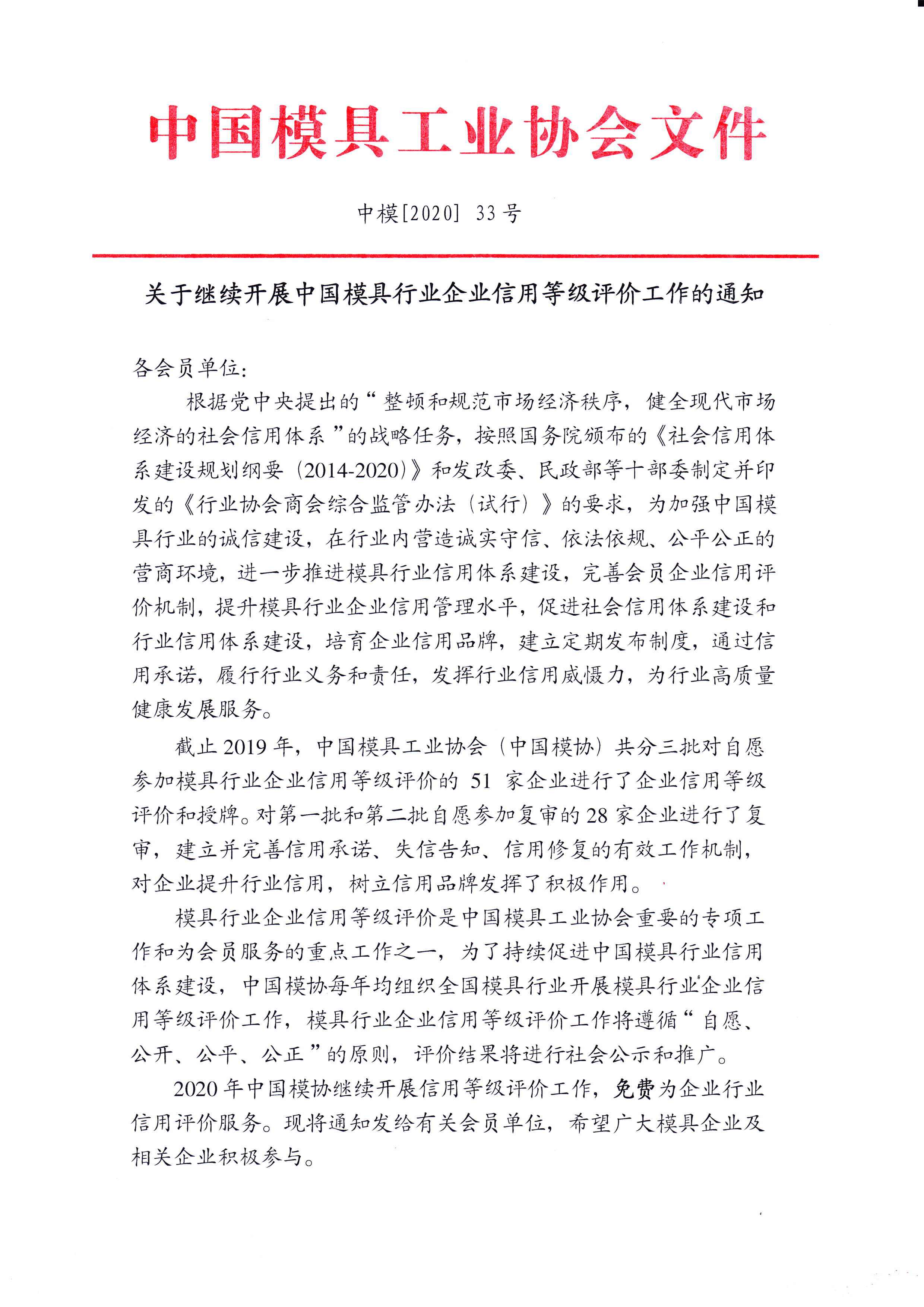 關(guān)于繼續(xù)開展中國模具行業(yè)企業(yè)信用等級評價工作的通知