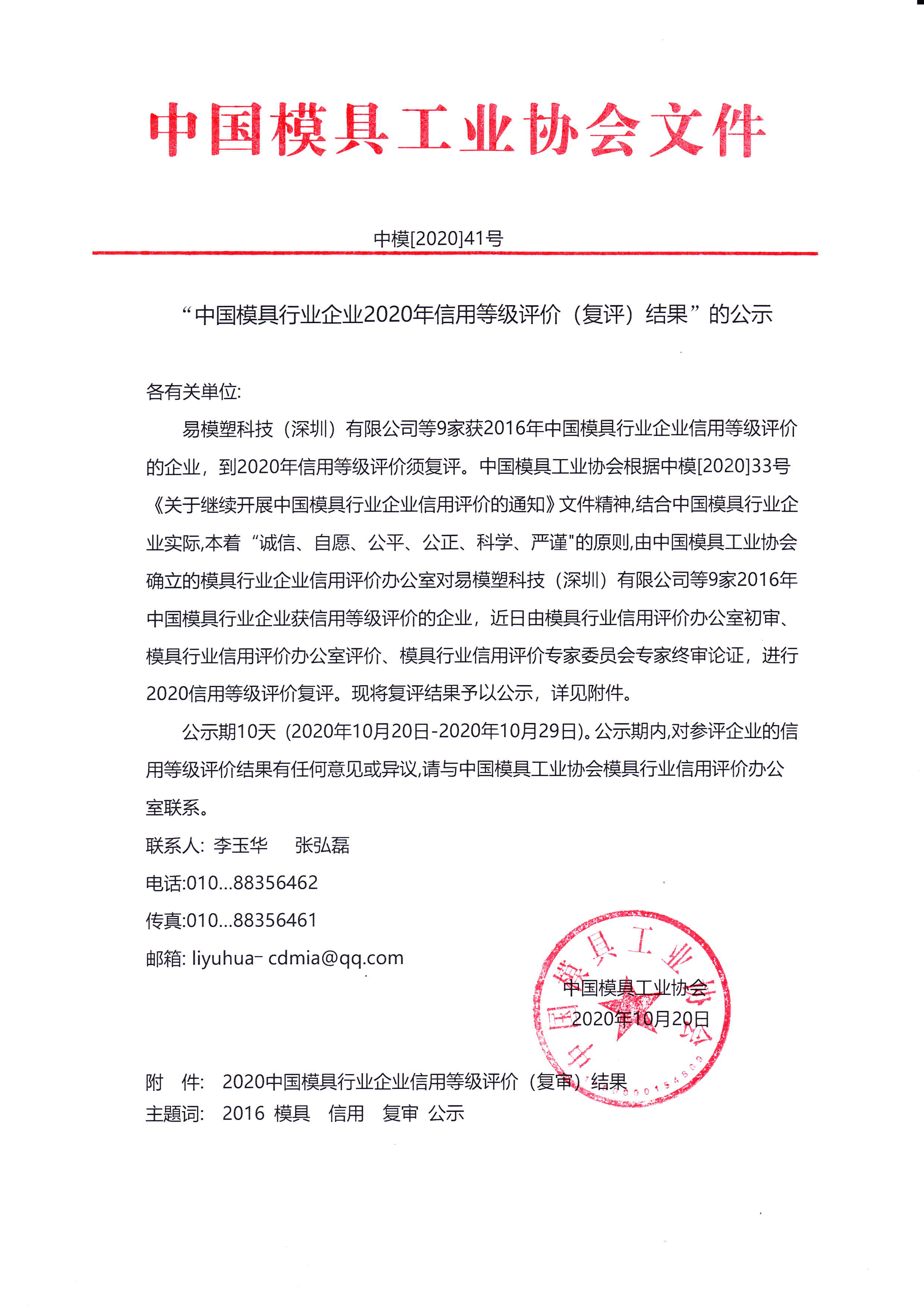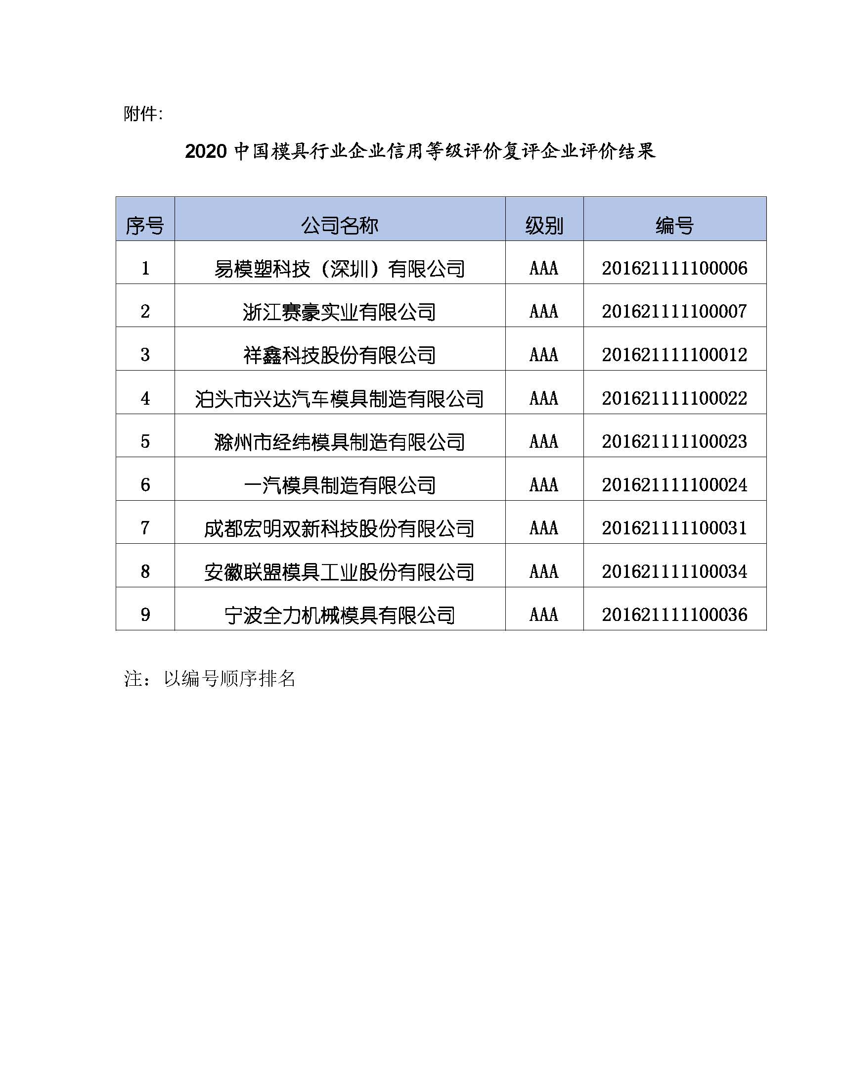 “中國模具行業企業2020年信用等級評價(復評)結果”的公示