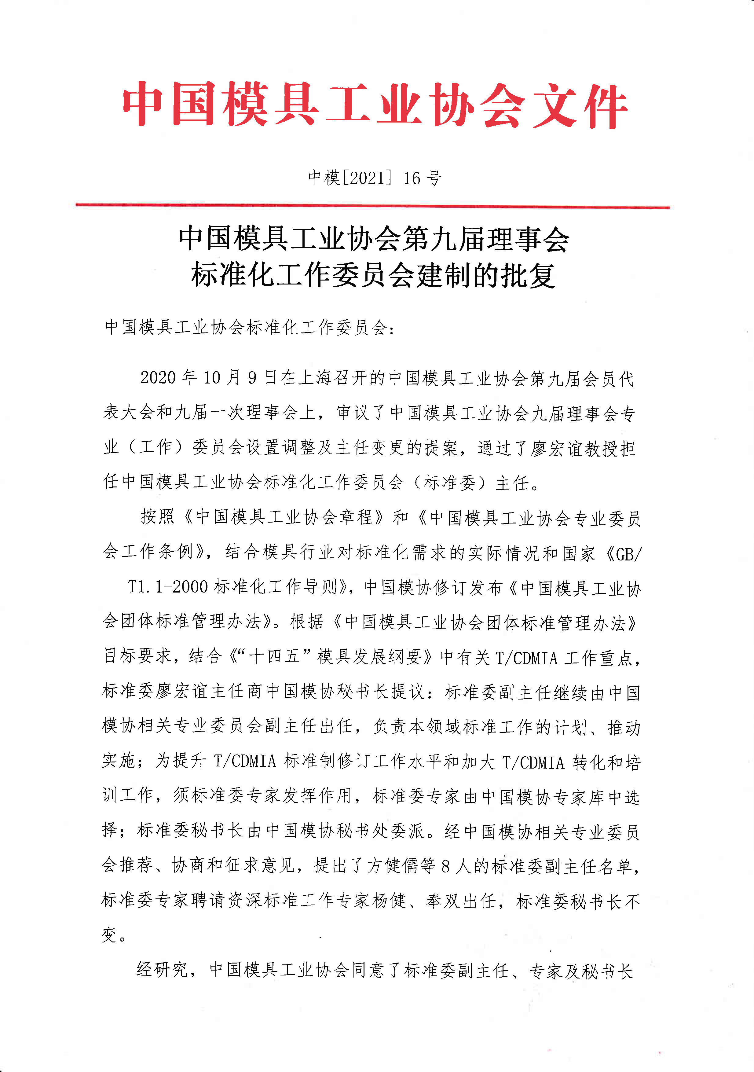 第九屆理事會(huì)標(biāo)準(zhǔn)化工作委員會(huì)建制的批復(fù)