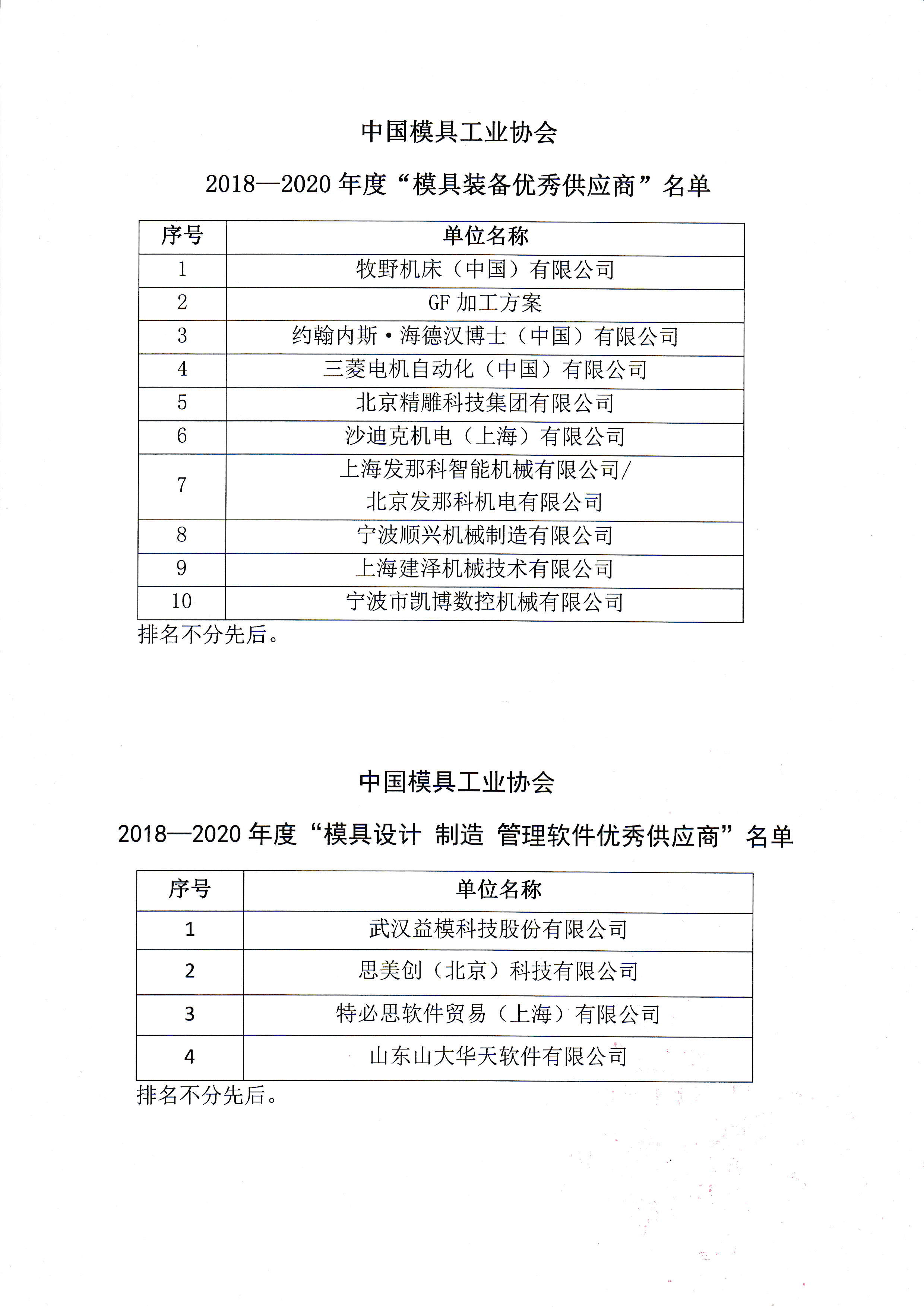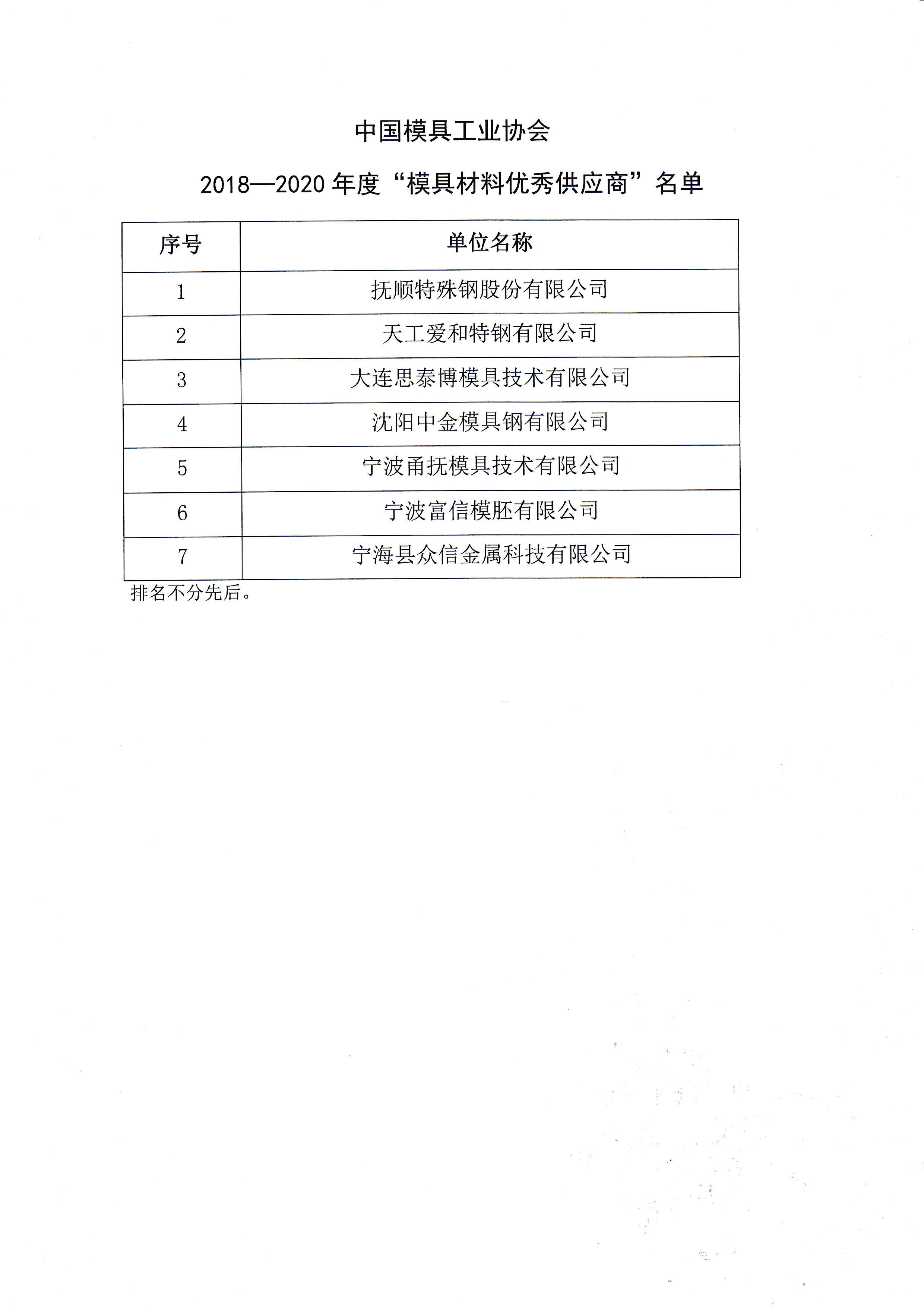 2018—2020年度 模具裝備優秀供應商 模具設計制造管理軟件優秀供應商 模具材料優秀供應商 評定結果