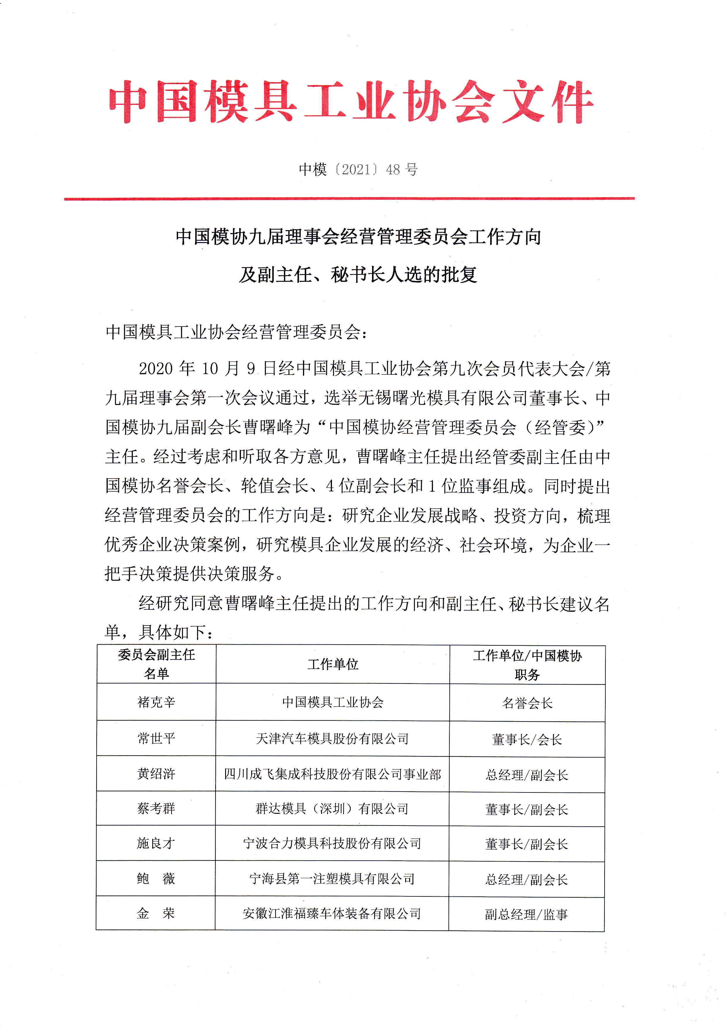 中國模協九屆理事會經營管理委員會工作方向及副主任、秘書長人選的批復