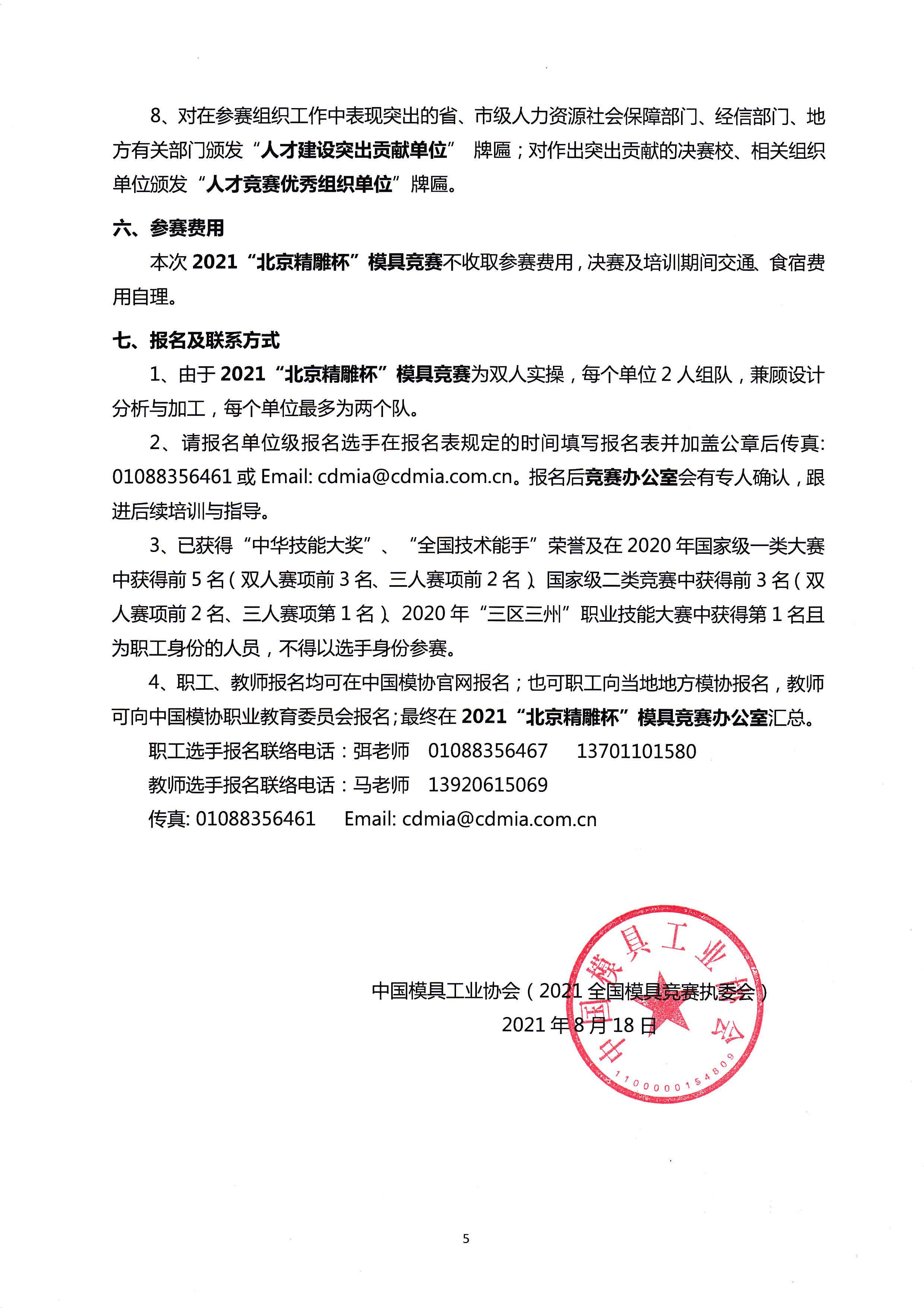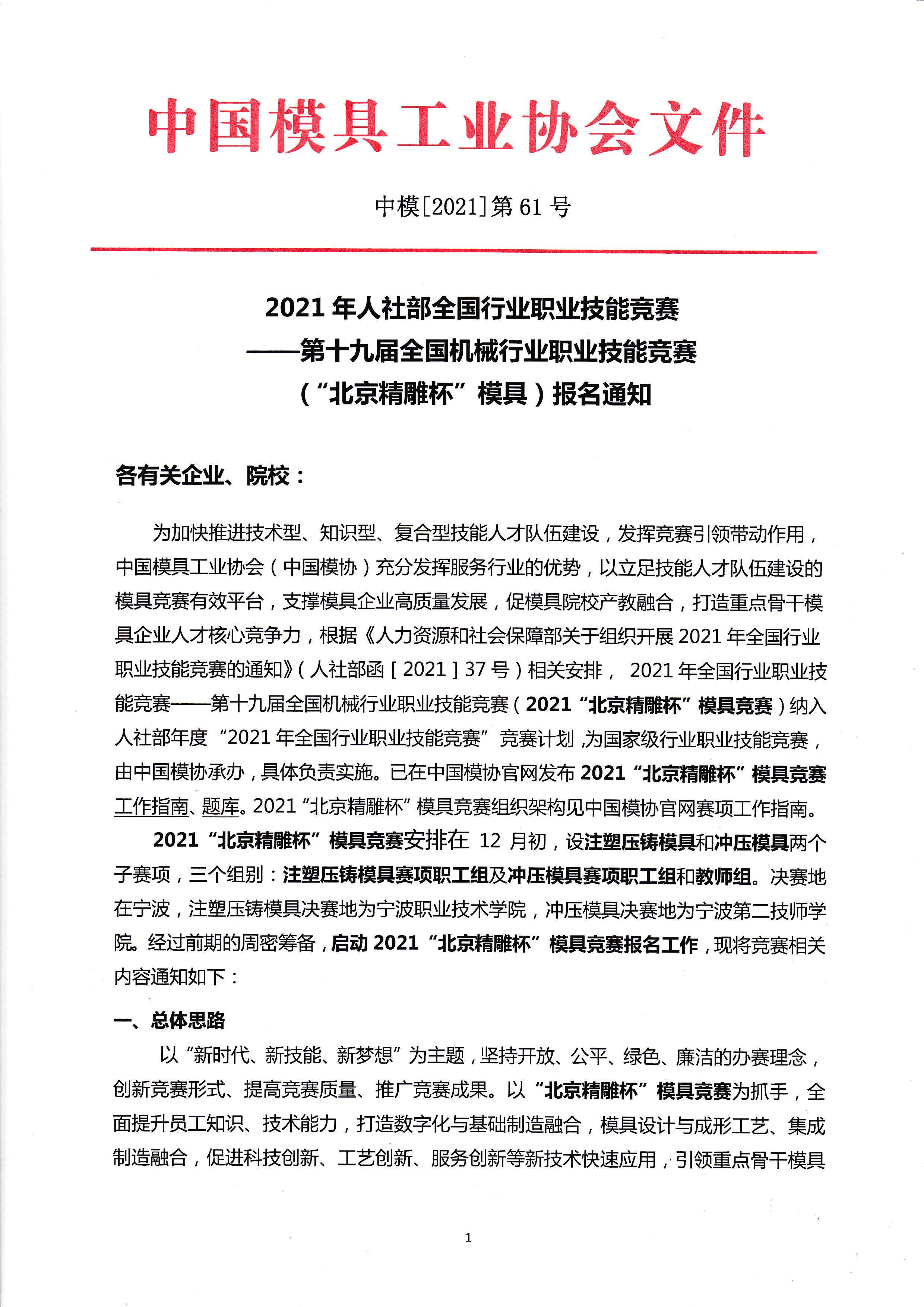 2021年人社部全國行業職業技能競賽——第十九屆全國機械行業職業技能競賽(“北京精雕杯”模具)報名通知