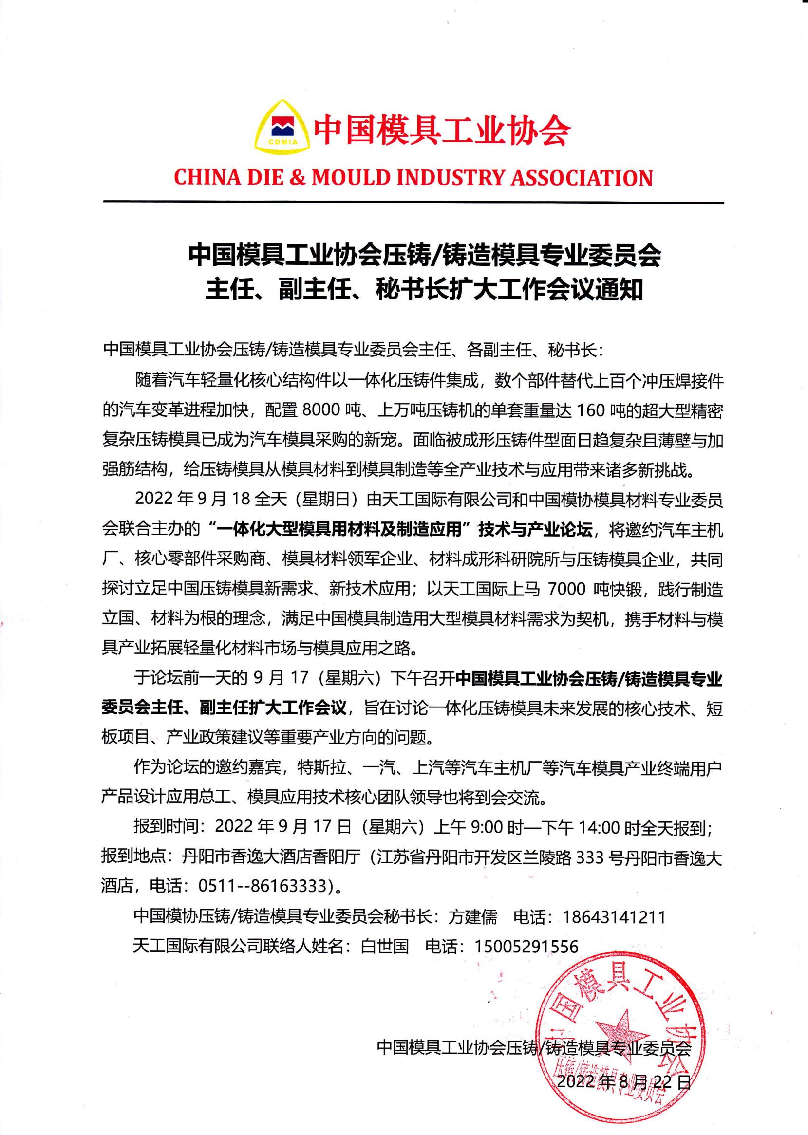 2.中國模具工業(yè)協(xié)會壓鑄/鑄造模具專業(yè)委員會主任、副主任工作會議時間:9月17日下午