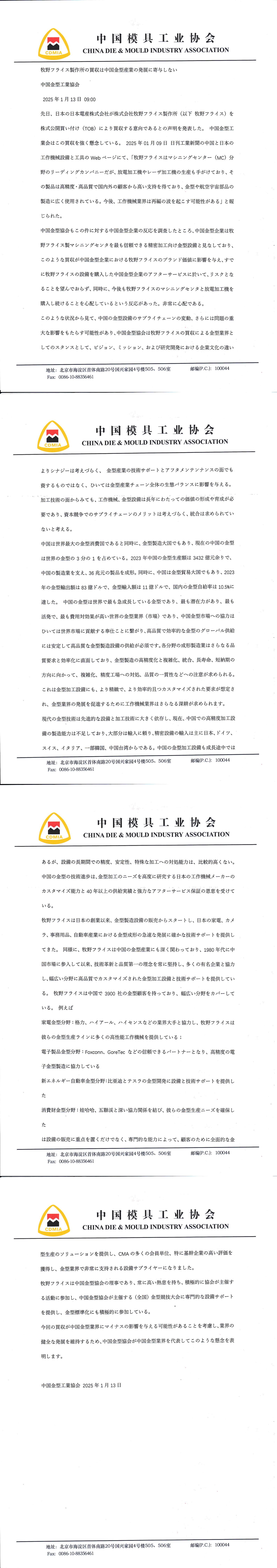 牧野フライ又製作所の買収 は中國金型産業の発 展に寄與 し本い